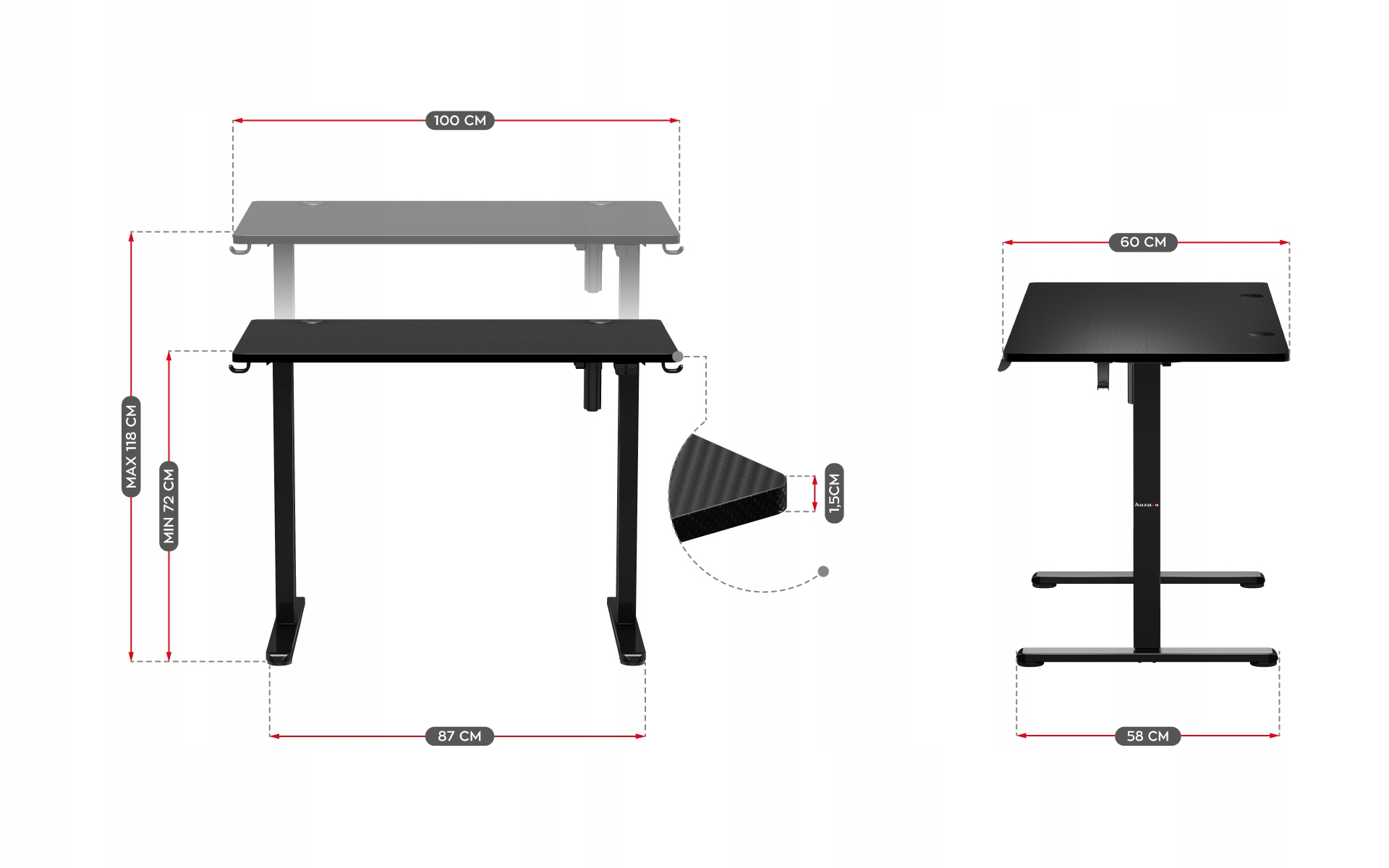 Biurko z regulowaną wysokością blatu to doskonały towarzysz wielogodzinnych sesji gamingowych, maratonów nauki i intensywnej pracy. Dzięki możliwości obniżania i podnoszenia blatu możesz w każdej chwili przyjąć wygodną pozycję. Regulacja wysokości biurka w zakresie od 72 do 118 cm pozwala na pracę na stojąco i siedząco.