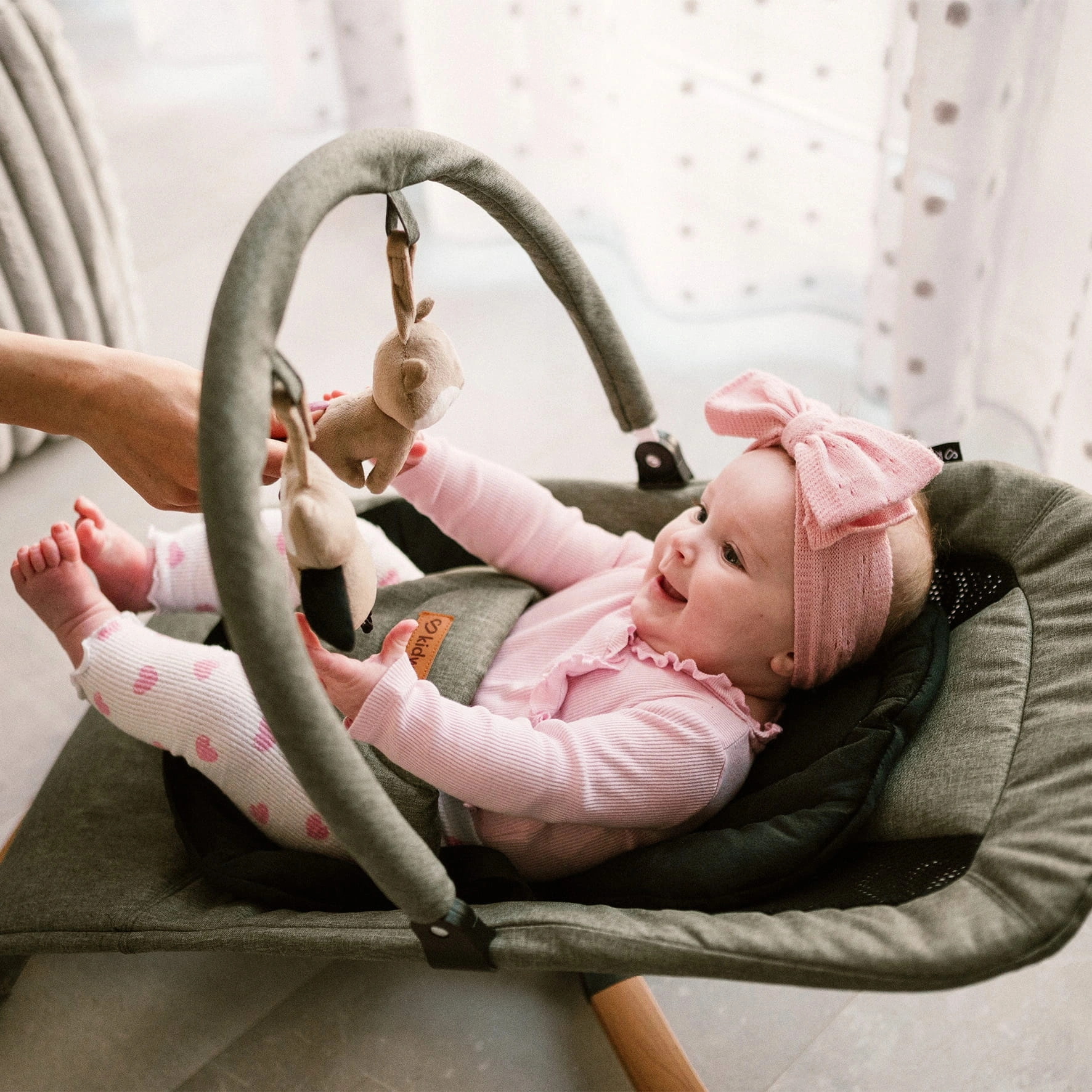 Kidwell Rubi wyposażono w regulowany pałąk z dwiema uroczymi miękkimi zabawkami. Możesz ustawić go tak, aby maluch swobodnie sięgał po zabawki, podziwiał je z bliska albo by były poza zasięgiem wzroku – w zależności od nastroju i potrzeb.