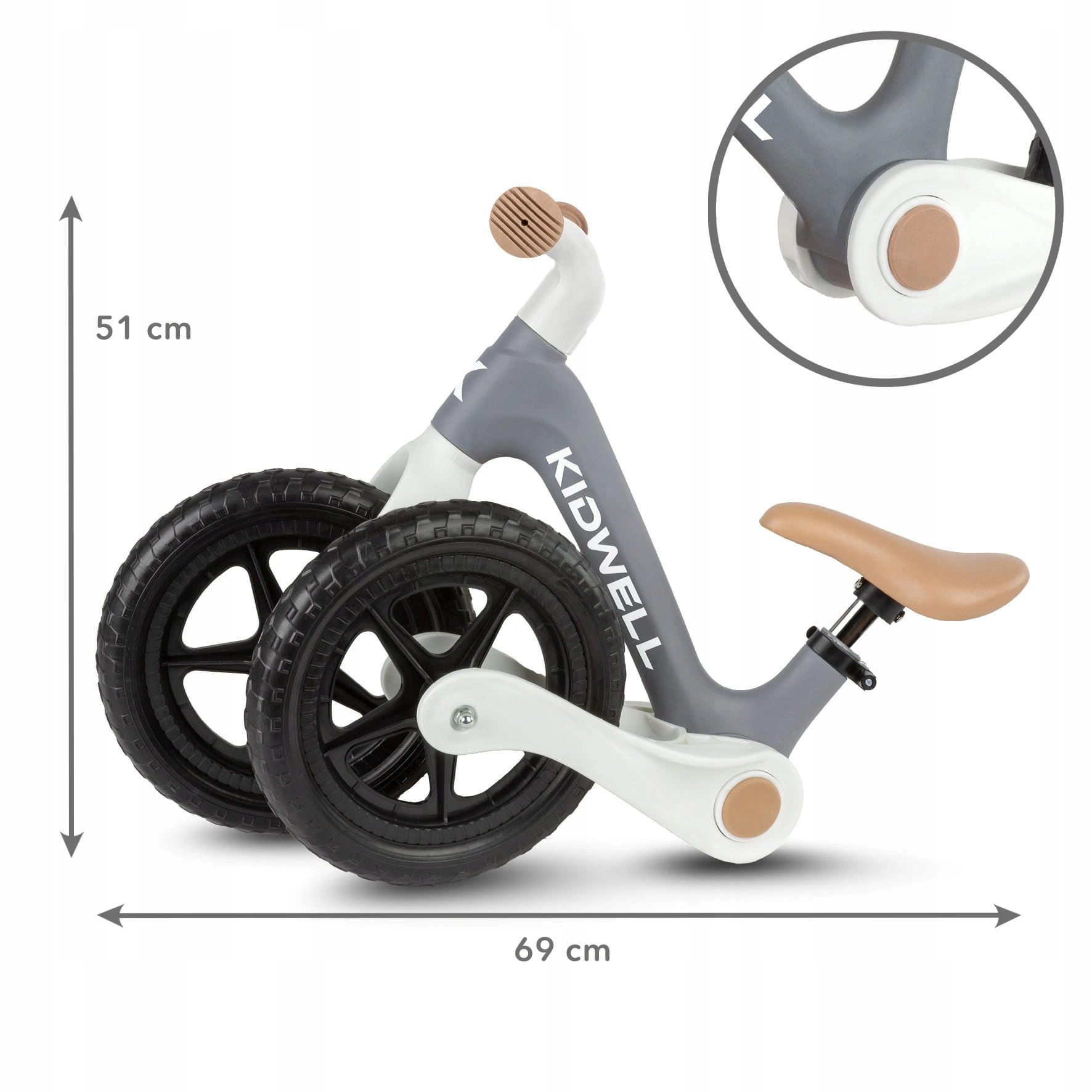 Rowerek biegowy Kidwell FLEX posiada duże koła EVA o średnicy 29 cm, które zapewniają komfort jazdy na każdej nawierzchni.