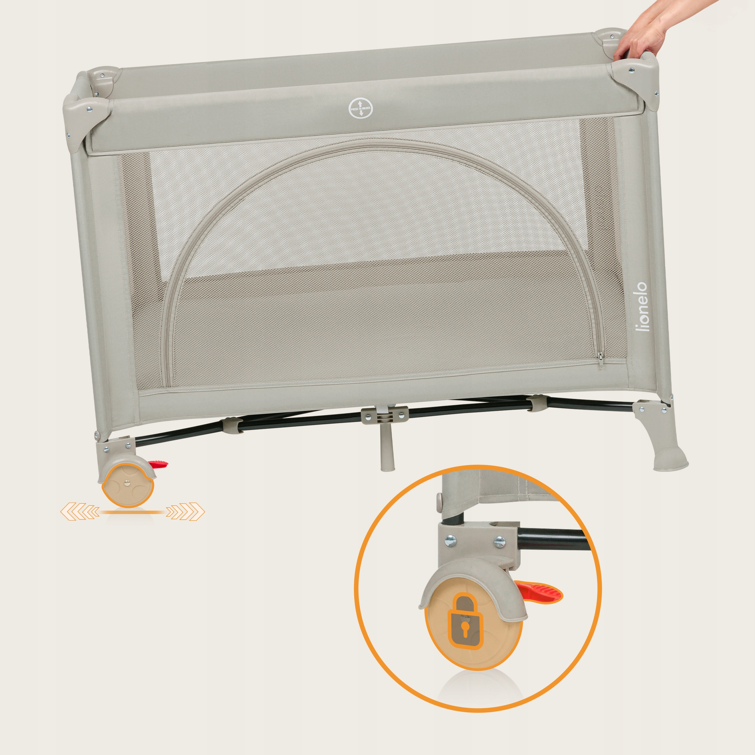 Dzięki dwóm kółkom z hamulcami Kompaktowe łóżeczko turystyczne z funkcją kojca Lionelo Laura można łatwo przestawiać.