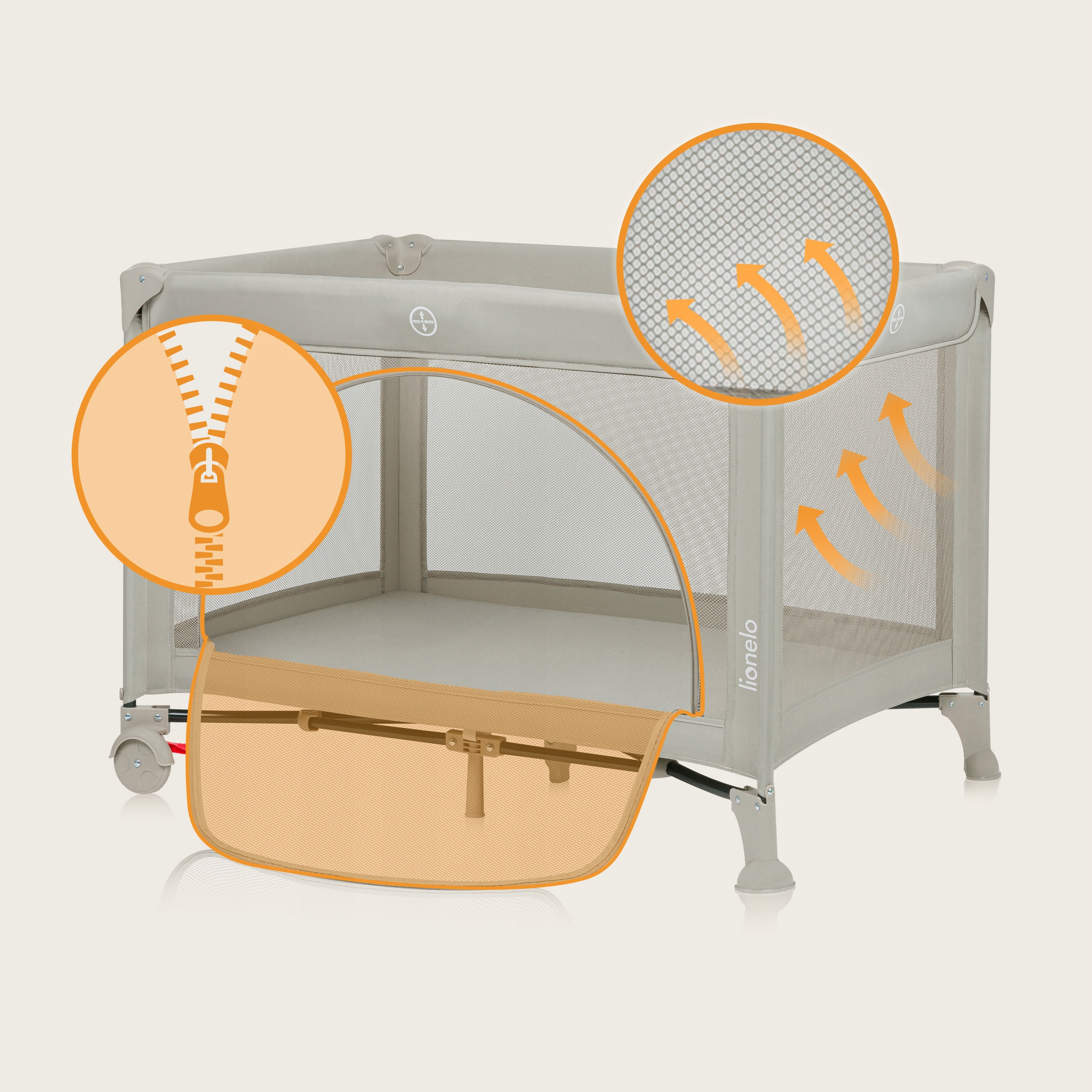 Kompaktowe łóżeczko turystyczne z funkcją kojca Lionelo Laura zapewnia odpowiednią cyrkulację powietrza i stały kontakt wzrokowy.