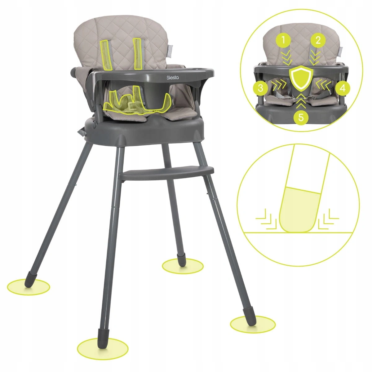 Miękkie materiały i regulowana konstrukcja dostosowują się do rosnących potrzeb Twojego maluszka, a stabilna budowa zapewnia bezpieczeństwo przez cały czas. Siesta 3w1 to idealne rozwiązanie na lata – od pierwszych posiłków po samodzielną zabawę.