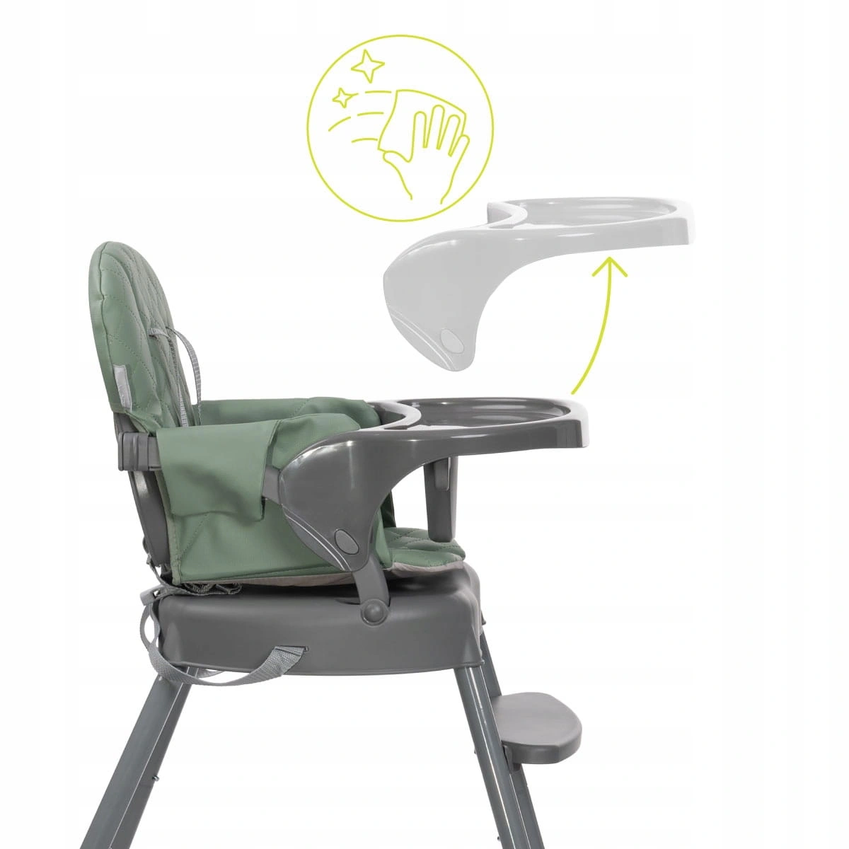 ✔️Krzesełko posiada zdejmowaną tackę. W przypadku zabrudzenia możesz ją z łatwością odpiąć i wyczyścić . To znacznie ułatwia codzienne czynności związane z karmieniem malucha