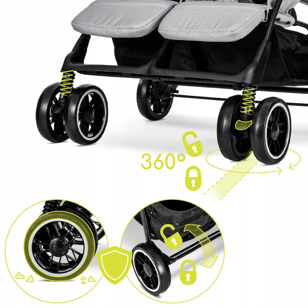 Dzięki temu zwrotny wózek spacerowy dla bliźniąt sprawdza się w sklepach, windach i na chodnikach.