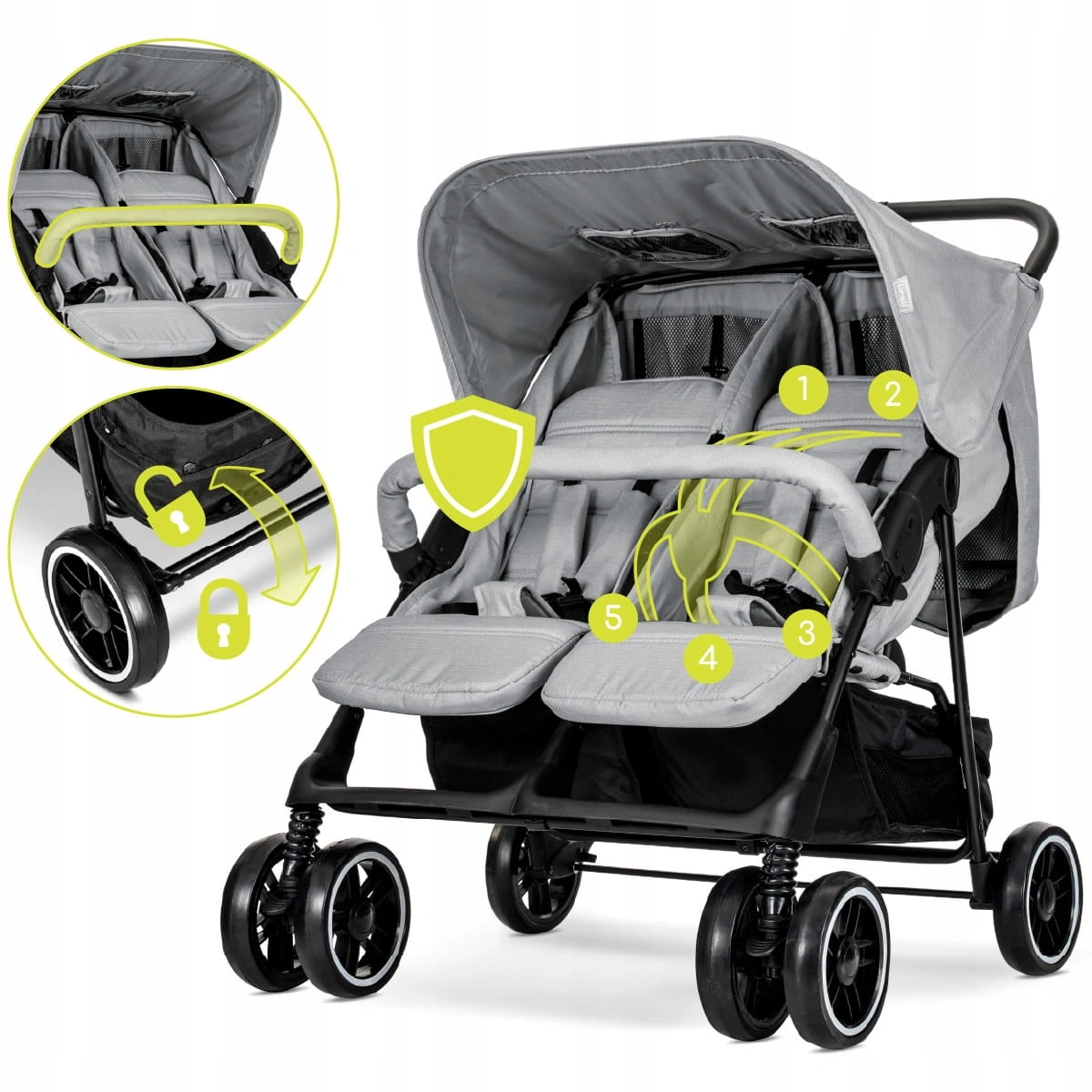 Ten bezpieczny wózek spacerowy dla bliźniaków z pasami 5 punktowymi oferuje: