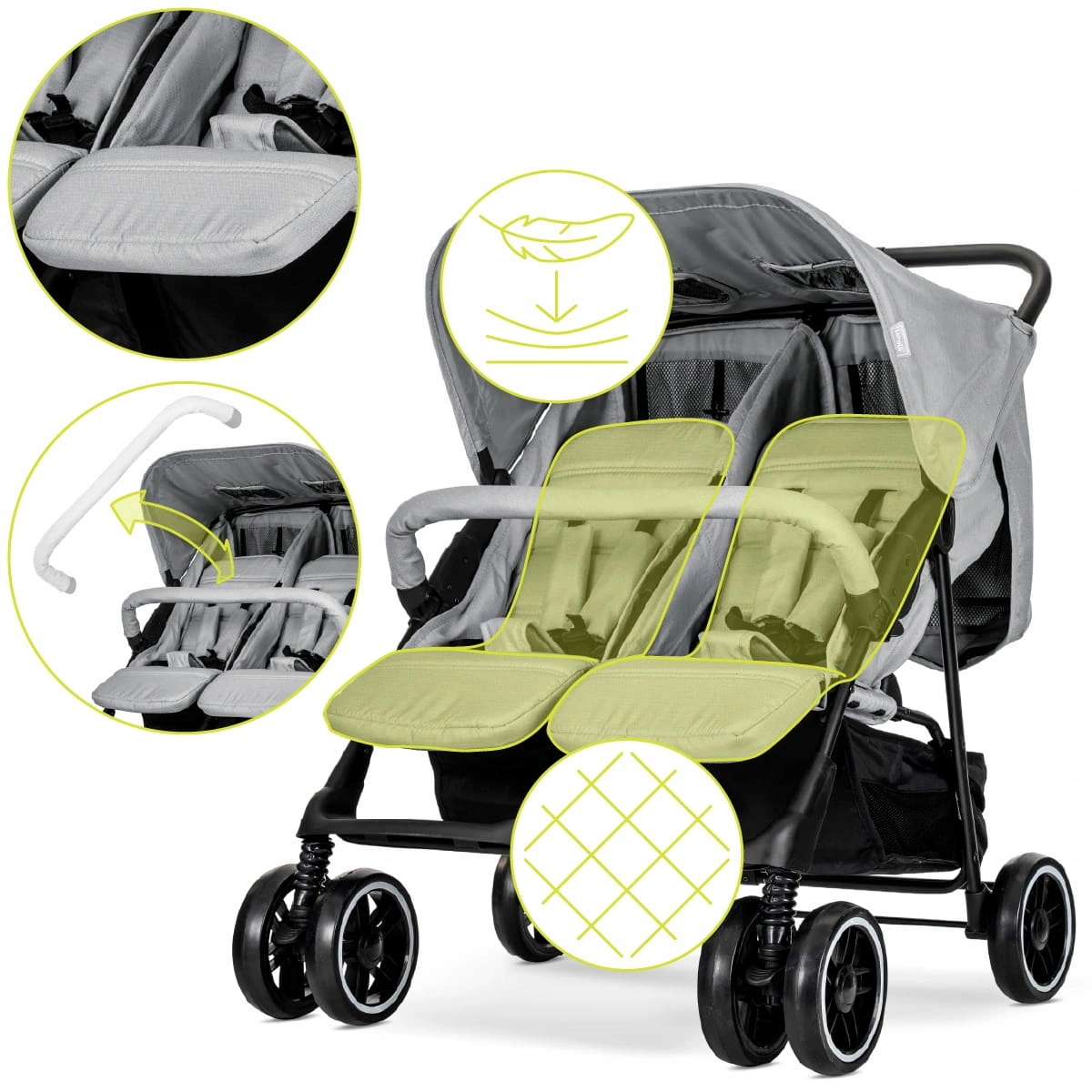 To nie jest zwykła spacerówka. To podwójny wózek spacerowy dla bliźniaków z regulacją i lekką konstrukcją, który sprawdzi się zarówno podczas krótkich spacerów, jak i dłuższych wyjść do miasta.