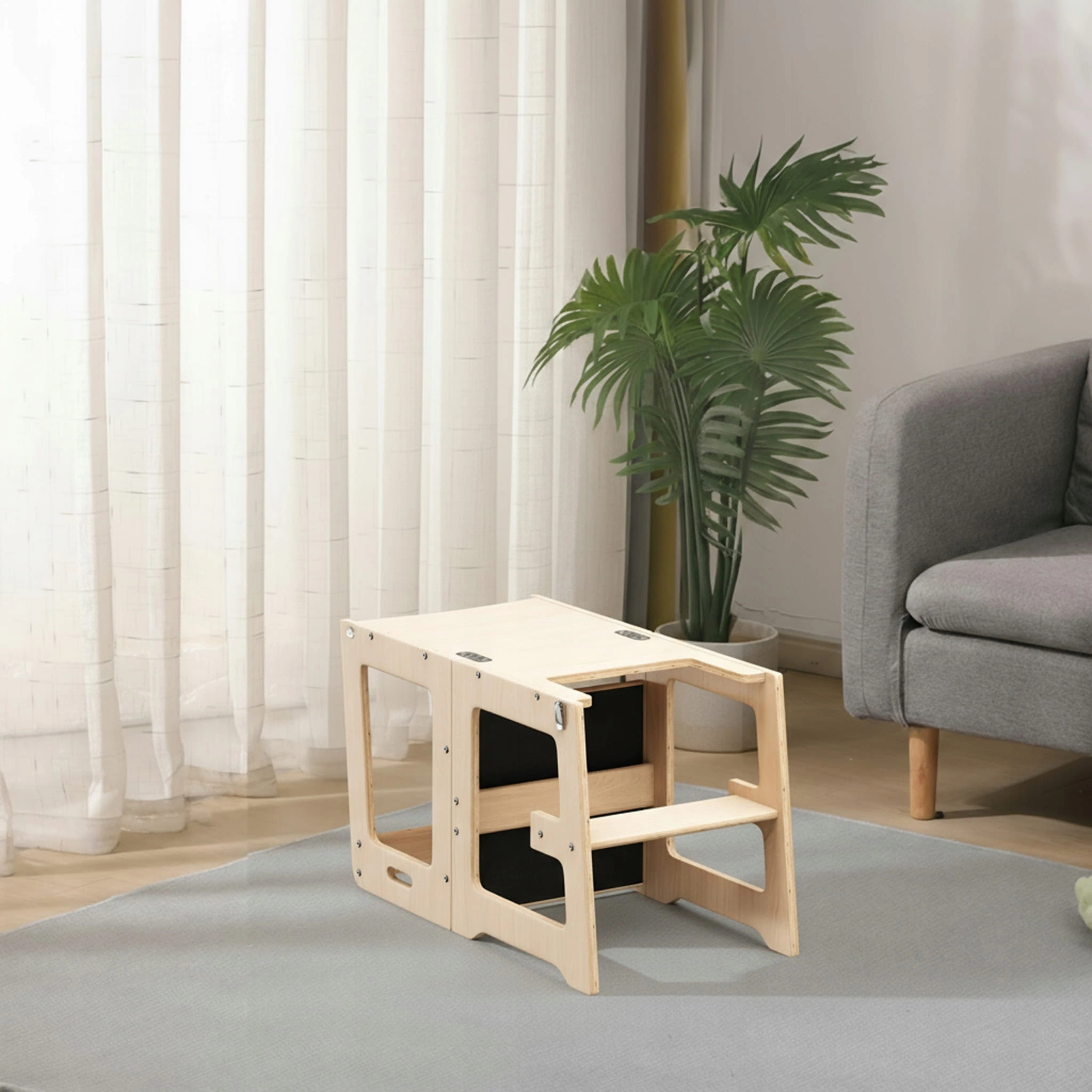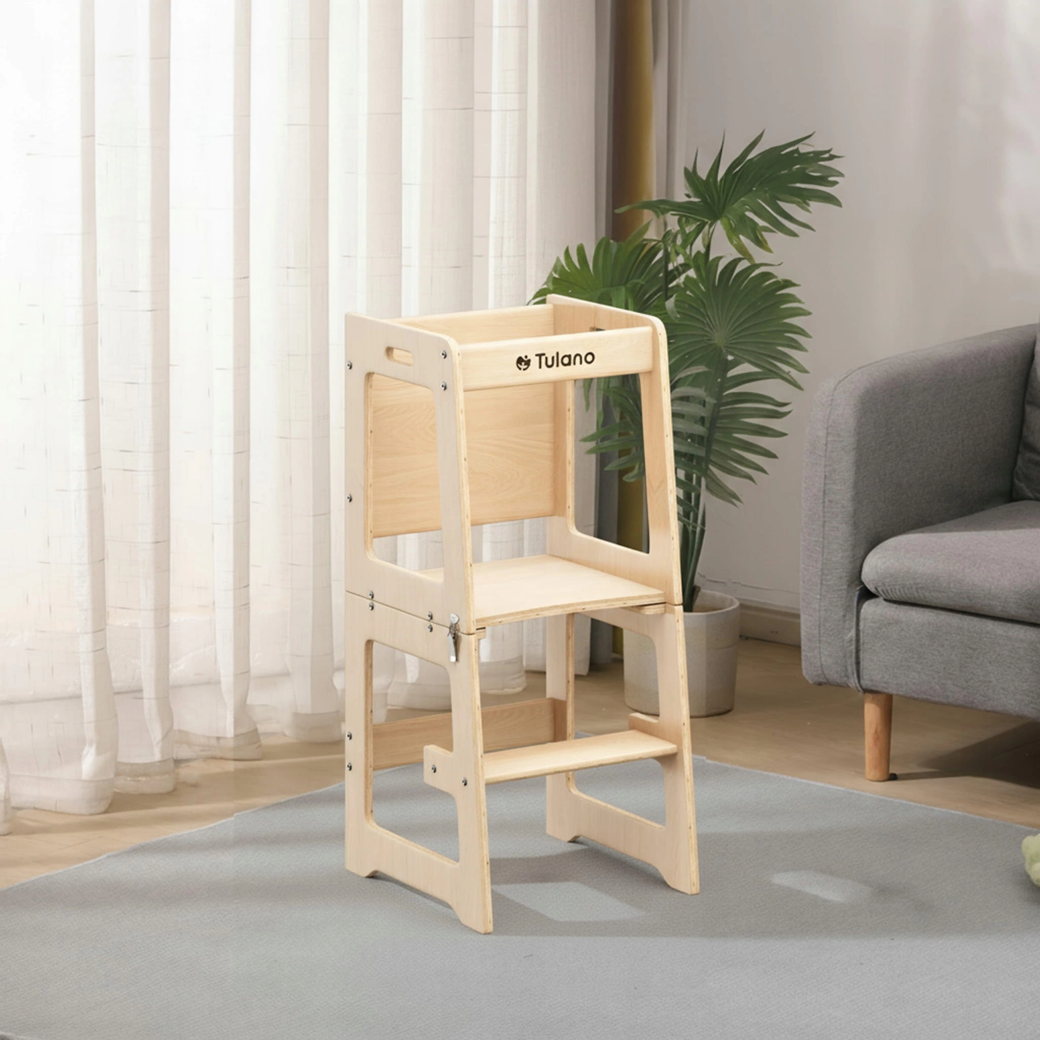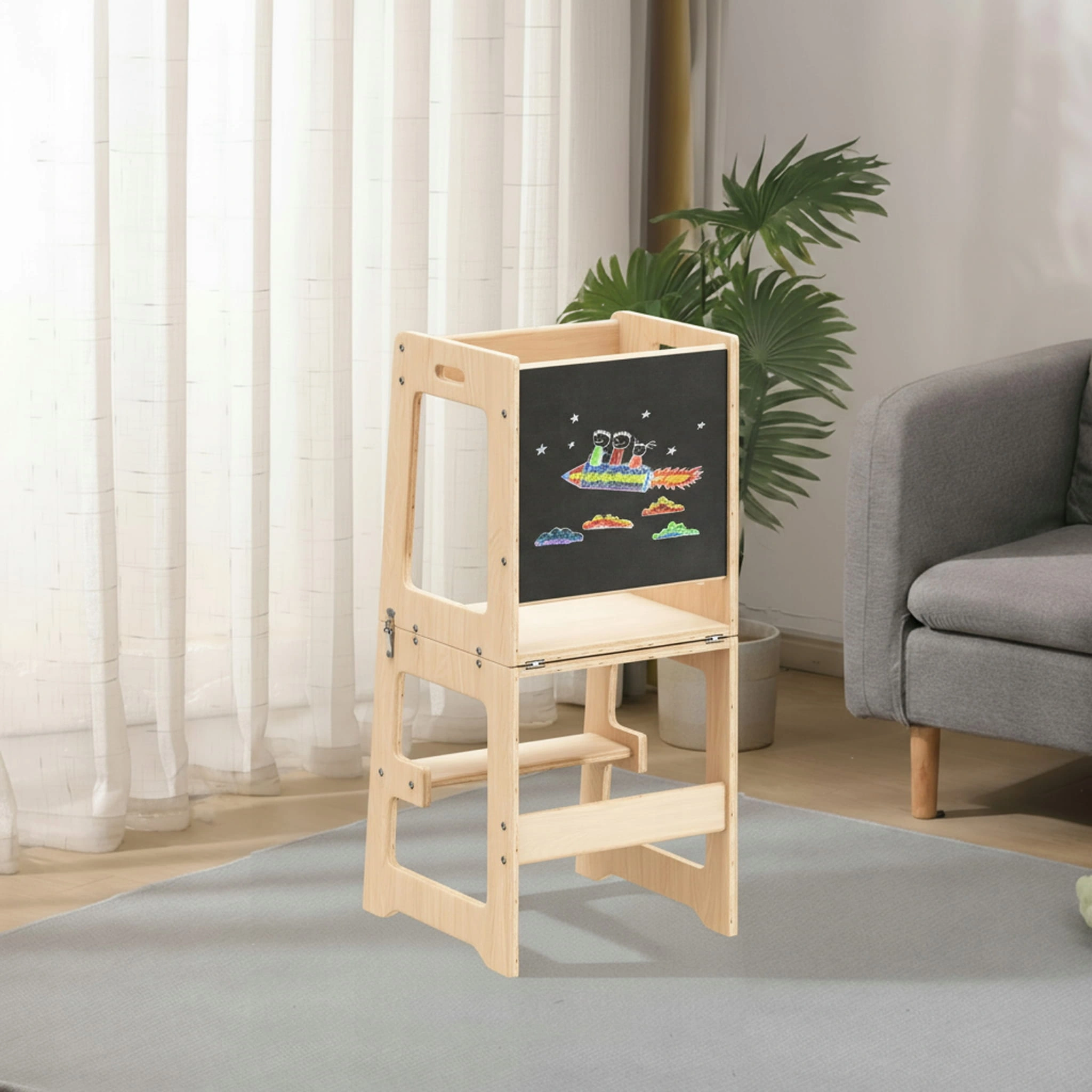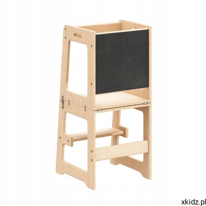 To doskonały drewniany pomocnik kuchenny z tablicą kredową dla dziecka, który wspiera rozwój twórczy i zachęca do samodzielnej zabawy.