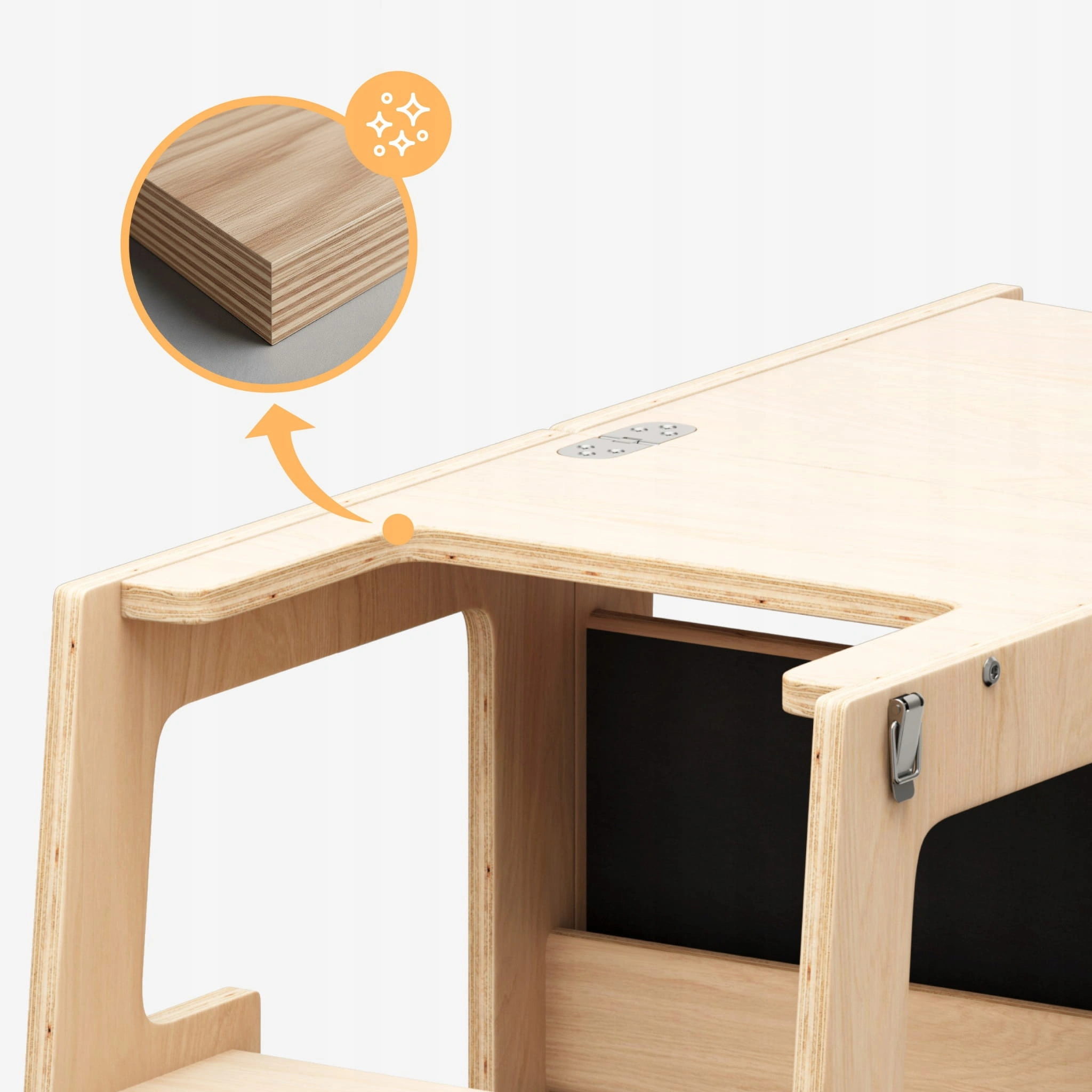 Pomocnik kuchenny z funkcją stolika Mooby 35 3w1 dla dziecka do 60 kg został wykonany z trwałej, laminowanej płyty MDF odpornej na zabrudzenia. Gładka powierzchnia ułatwia czyszczenie – wystarczy wilgotna ściereczka.