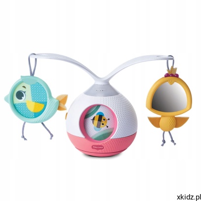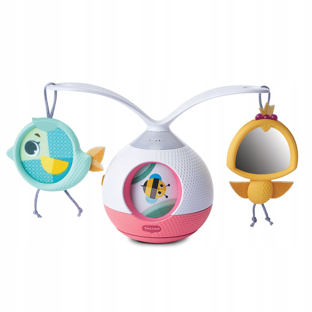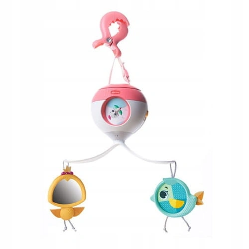 Zabawka posiada balansujący ruch i obracające się o 360° ramiona, na których wiszą przyjazne postacie zwierzątek, z lusterkiem i grafiką spirali, aby nieustannie inspirować dziecko do podnoszenia główki.