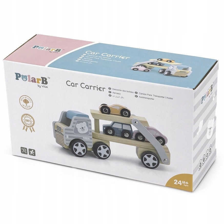 Auto laweta z samochodami od firmy Viga w nowej kolekcji POLAR BEAR to jedna z najwspanialszych zabawek, która będzie służyła długo i zapewni Twojemu dziecku wiele lat ciekawej i kreatywnej zabawy. Drewniany główny pojazd ma dwa poziomy, na których umieszczone są 3 różnokolorowe auta. Górną płytę można opuścić, tak aby stworzyła rampę, po której zjadą samochody. Dodatkowym atutem jest zamontowany kołeczek dzięki, któremu można było odpiąć lawetę lub swobodnie skręcać naczepą. Drewniane autka sprawdzą się podczas zabawy w domu oraz w terenie. Dziecko chętnie zabierze je do piaskownicy czy plac zabaw. Maluch może odgrywać wiele scenek z pojazdami, co kształtuje jego wyobraźnię.