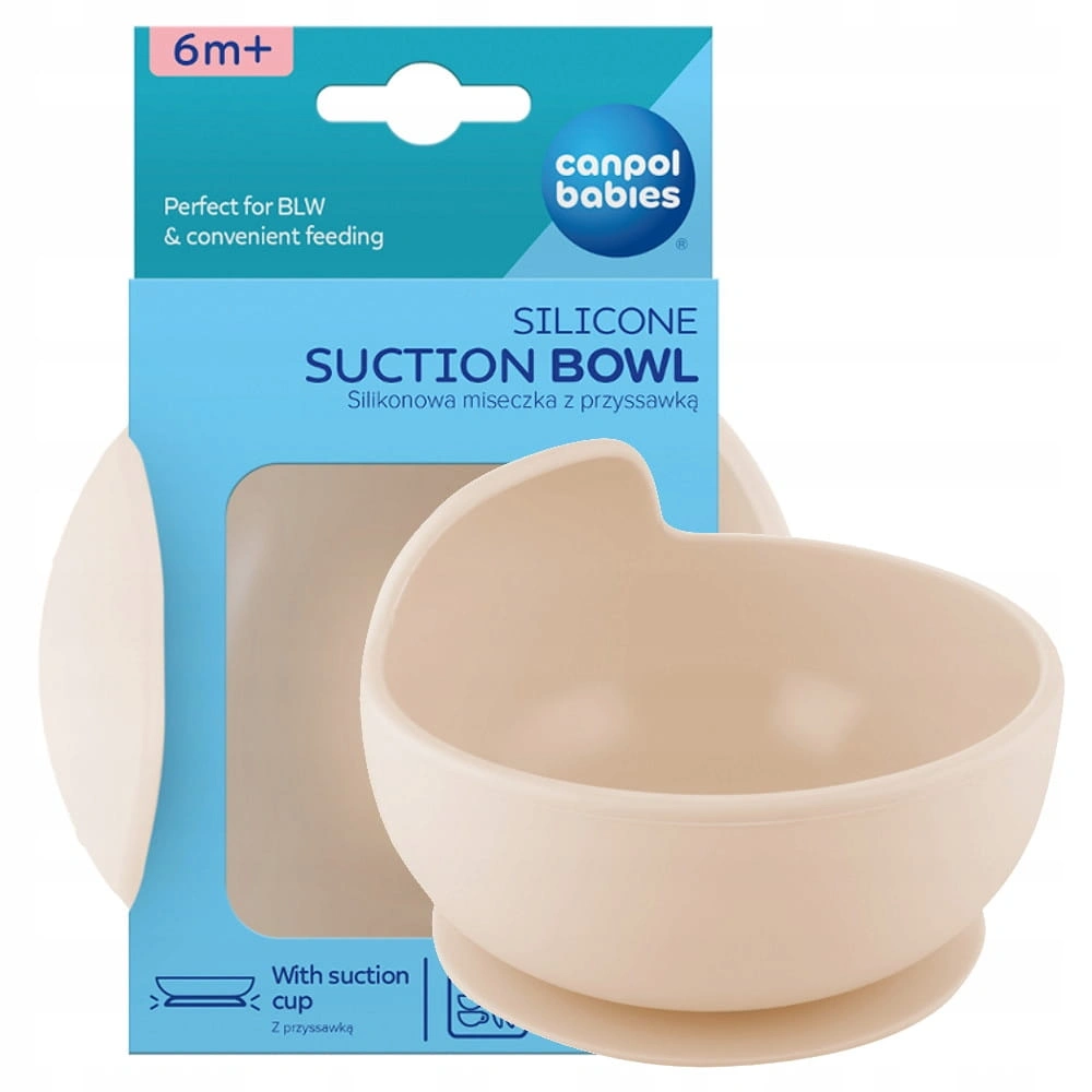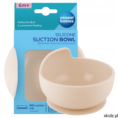 Silikonowa miseczka z przyssawką jest idealna do pierwszych posiłków Maluszka na początku jego przygody z rozszerzaniem diety, także metodą BLW. Miseczka Canpol babies ma antypoślizgową przyssawkę, która zapobiega niekontrolowanemu przemieszczaniu się naczynia po powierzchni stołu lub blatu krzesełka do karmienia, uniemożliwia wywrócenie naczynia lub zrzucenie w całości na podłogę. Zaokrąglone kształty oraz podwyższona wyprofilowana krawędź miski ułatwiają dziecku nabieranie jedzenia.