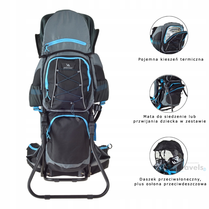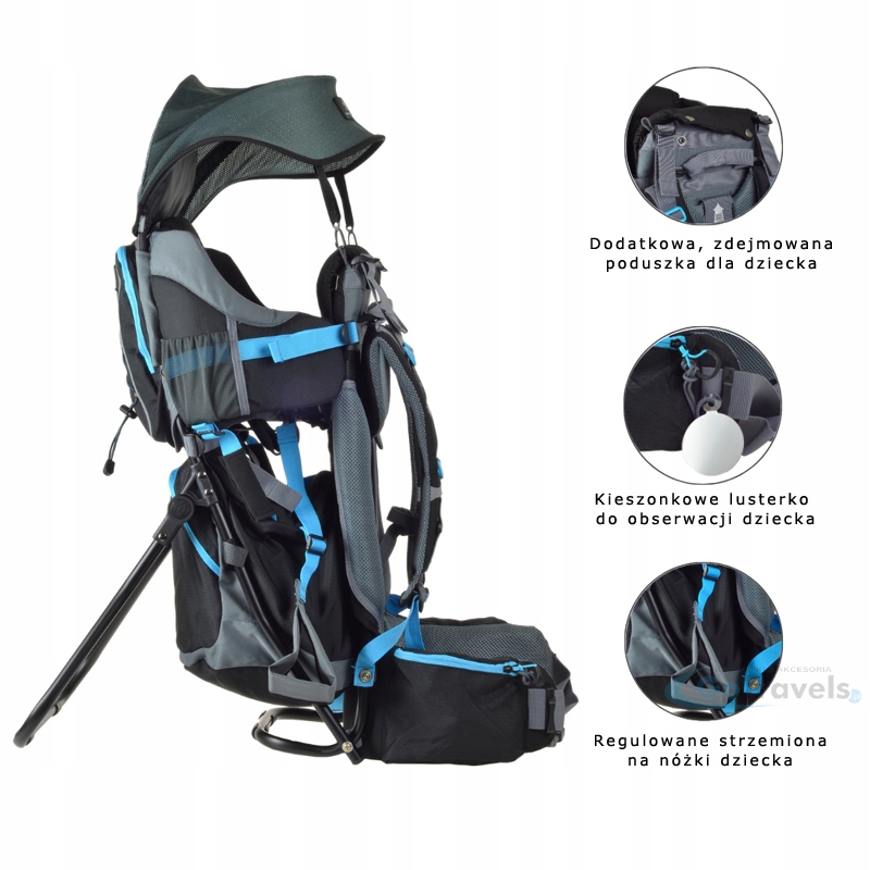 - Regulowane strzemiona (podpórki) na nogi dziecka będą bardzo przydatne podczas dłuższych wypraw.
