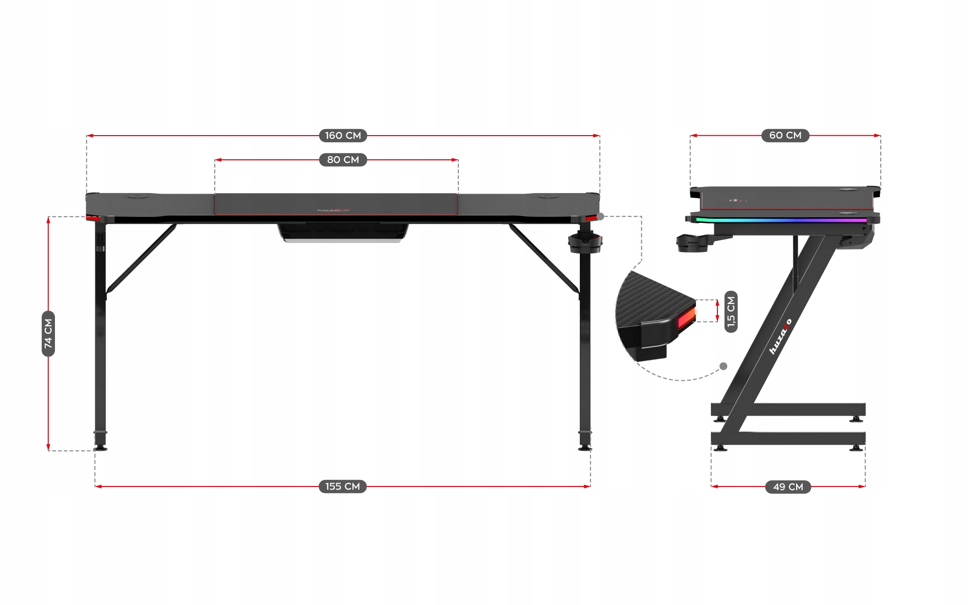 Huzaro biurko gamingowe komputerowe dla gracza uchwyty 160cm HERO 4.0 RGB
