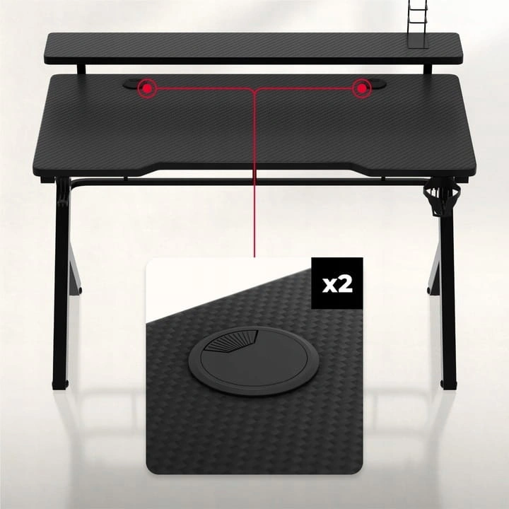 Biurko Huzaro Hero 5.0 posiada dwa wloty na organizację przewodów. Wloty zamontowano po dwóch stronach biurka, dzięki czemu niezależnie od instalacji Twoje stanowisko gamingowe zawsze będzie uporządkowane.