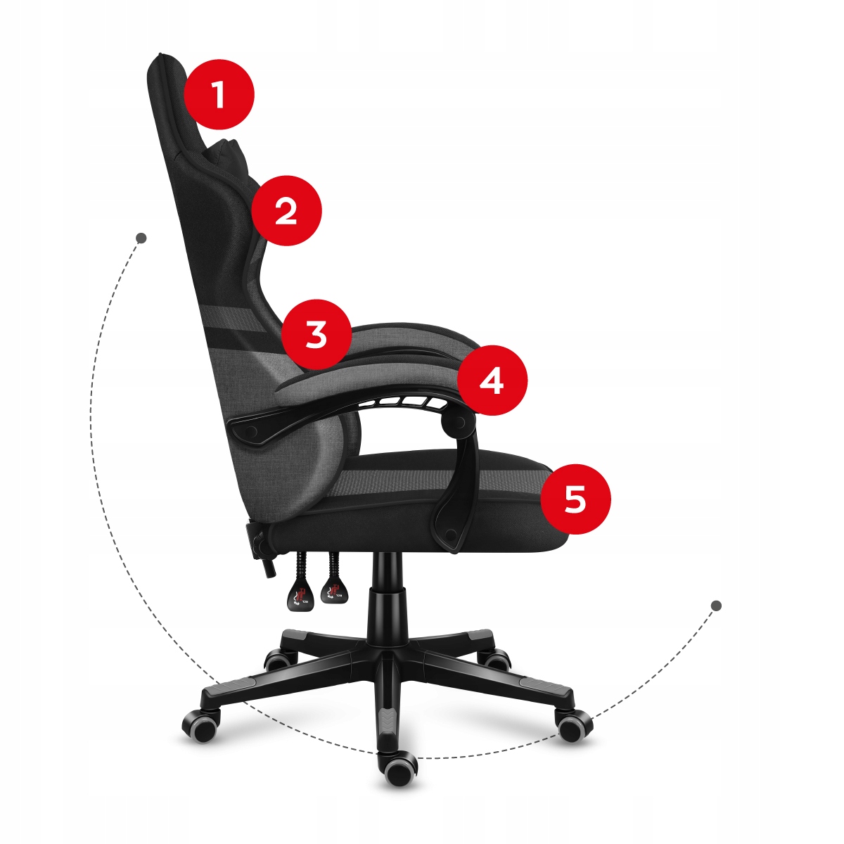 - Odchylenie oparcia skorelowane z wysuwającym się siedziskiem umożliwia przyjęcie ergonomicznej pozycji podczas grania lub pracy przy komputerze.