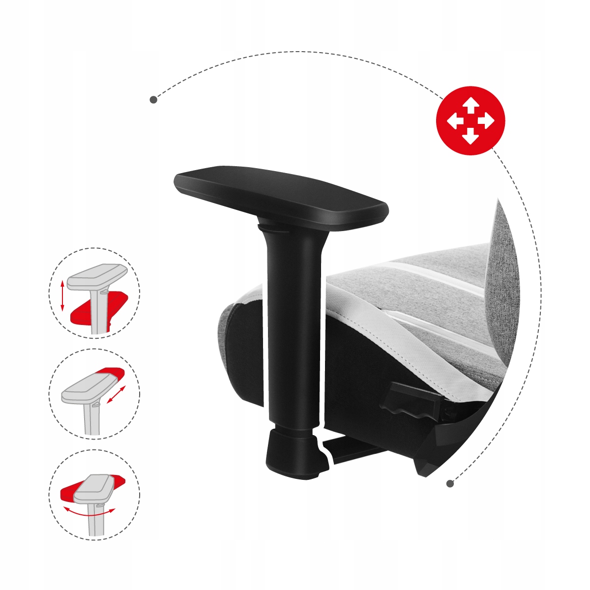 - Góra – dół, przód – tył, a może obrót? Podłokietniki 3D dają szerokie możliwości regulacji, dzięki czemu dopasujesz je do swoich potrzeb.