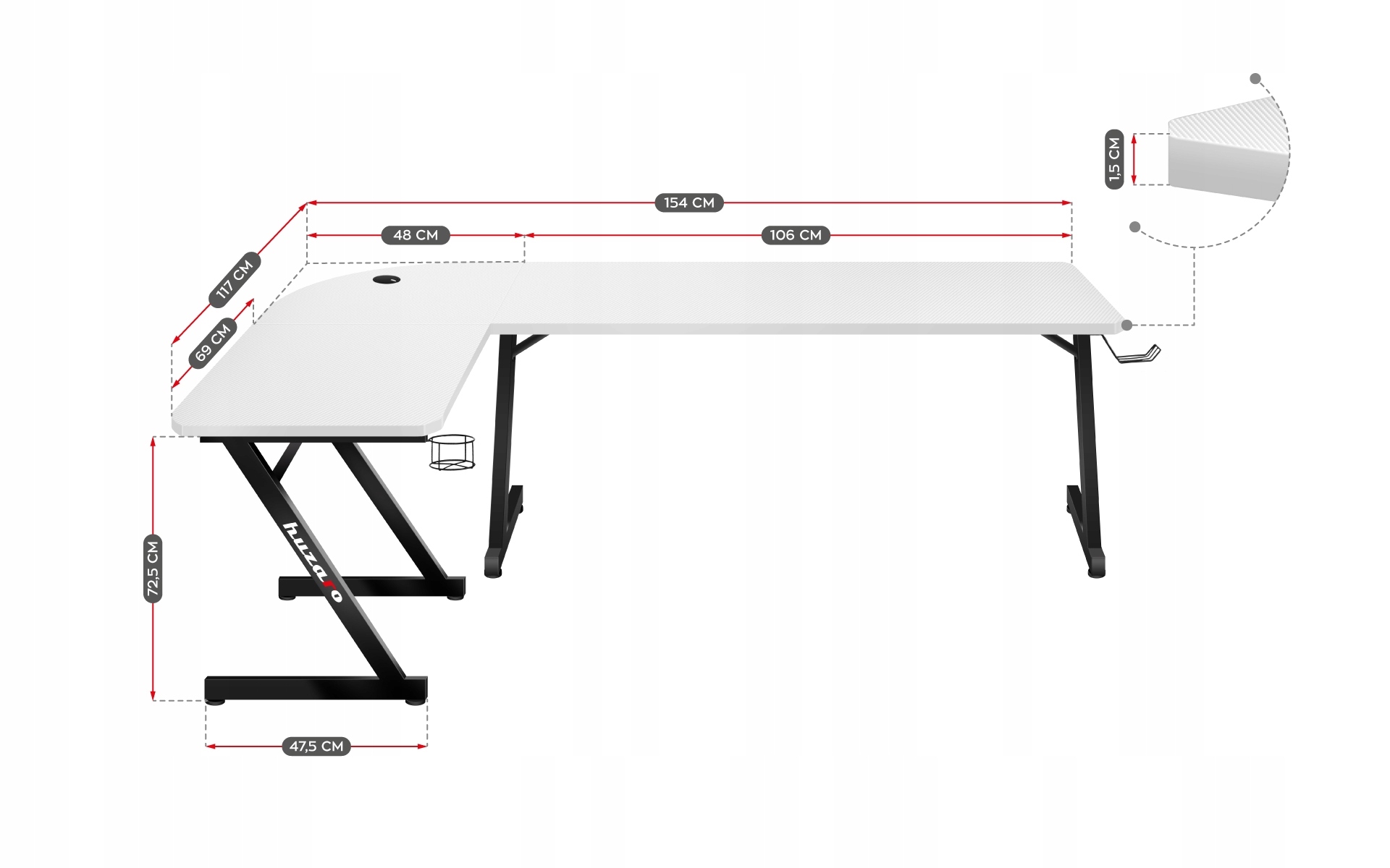 Huzaro narożne biurko gamingowe komputerowe z uchwytami HERO 7.0 White