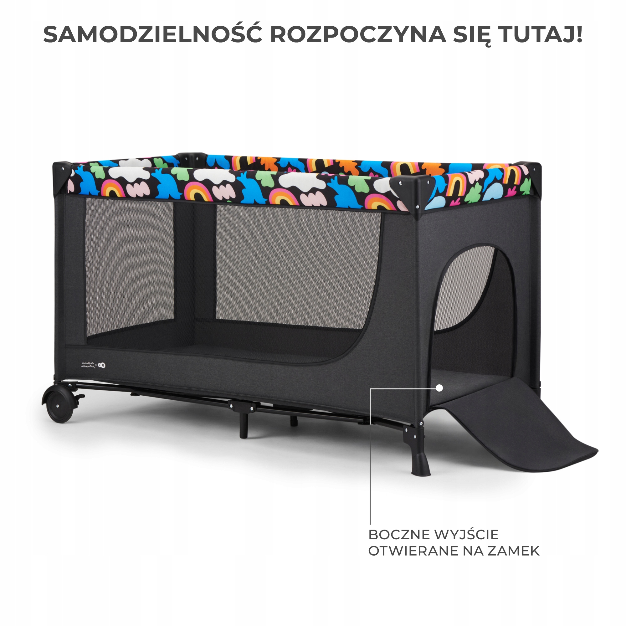 Kinderkraft JOY 2 łóżeczko turystyczne 2 w 1 składane w 5 sekund Happy Shapes wyposażone jest w boczne wejście zapinane na zamek błyskawiczny.