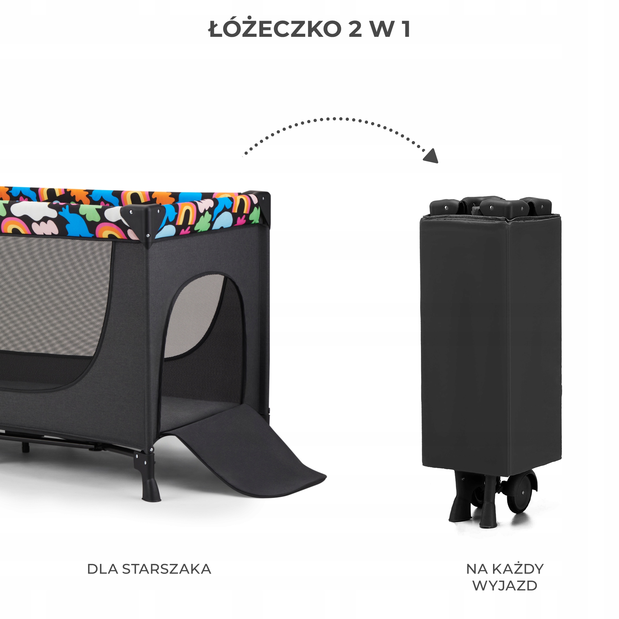 To łóżeczko turystyczne 2w1 z funkcją kojca dla dziecka, które sprawdzi się w mieszkaniu, domu jednorodzinnym, na wakacjach i podczas weekendowych wyjazdów.