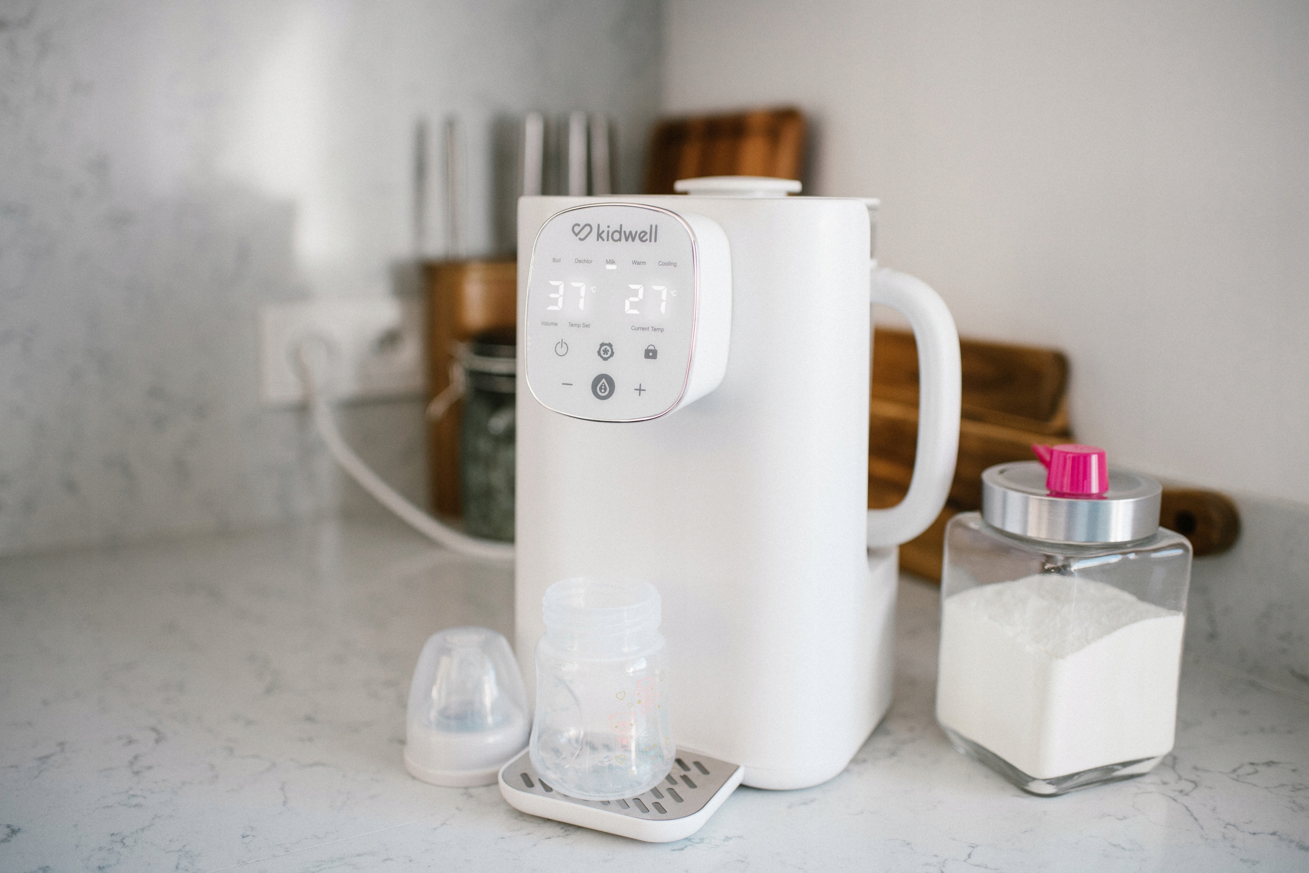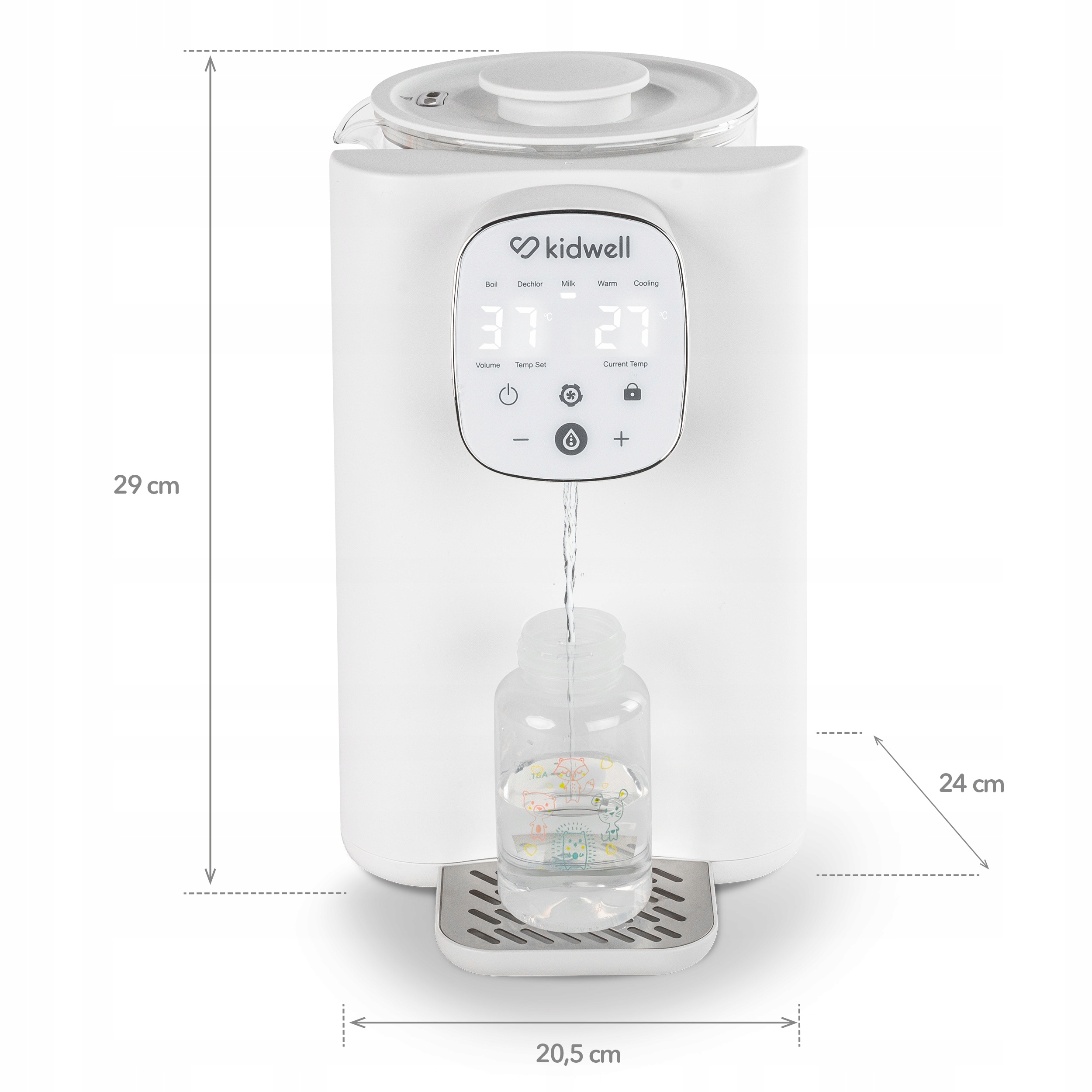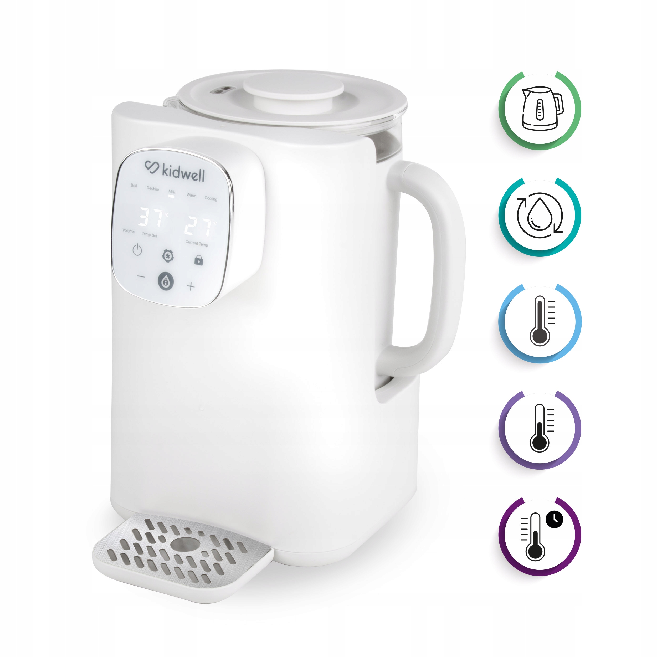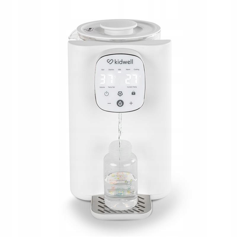 Kidwell PIIM to idealny przyjaciel rodziców zarówno młodszych, jak i nieco starszych dzieci. Precyzyjny termostat pozwala na dokładną kontrolę temperatury - możesz regulować jej wartość co 1°. W trybie MILK urządzenie grzeje wodę do 37°- jest to idealna temperatura do przygotowania mleka modyfikowanego.