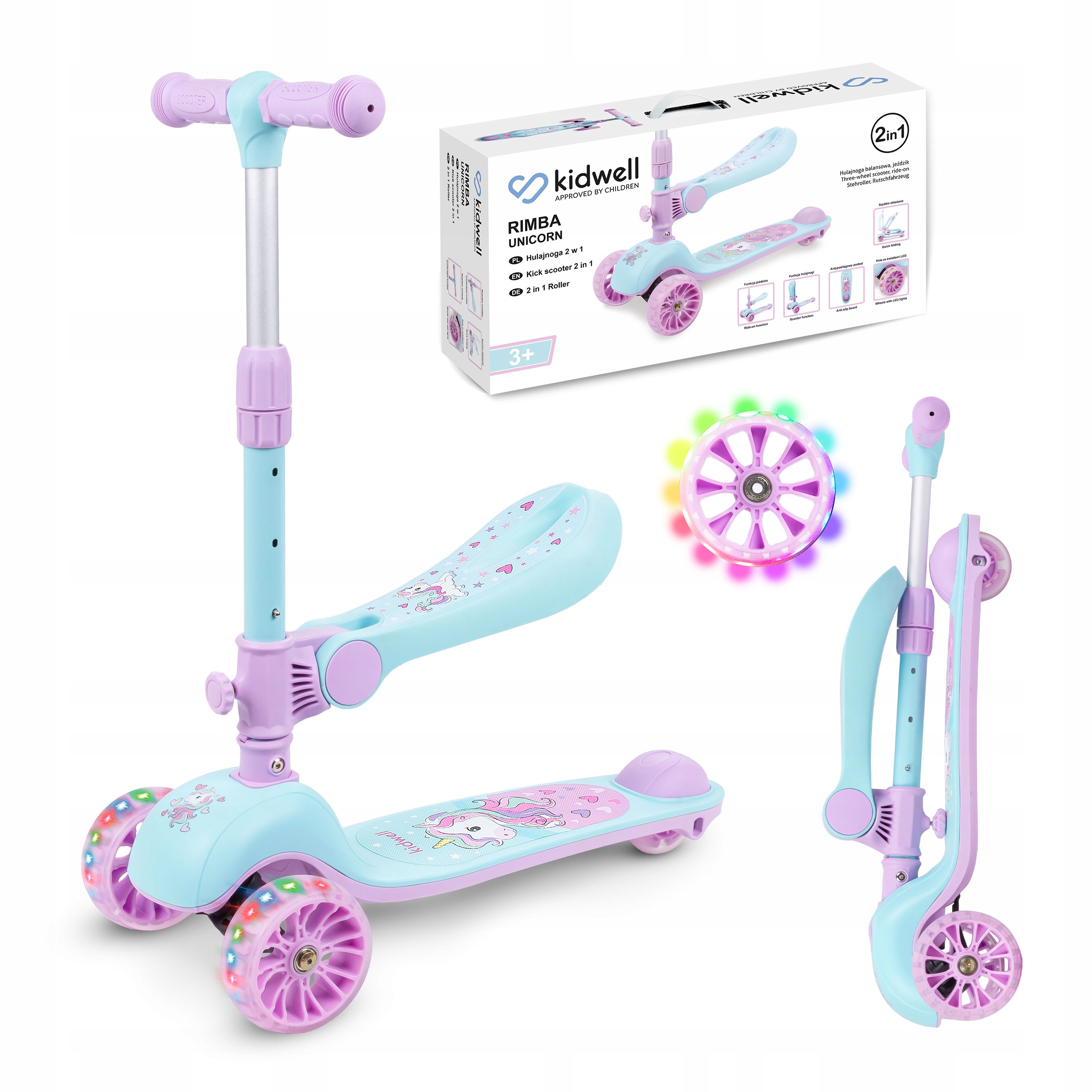 Kidwell Hulajnoga balansowa z siedziskiem 2w1 RIMBA jeździk LED Unicorn 3+
