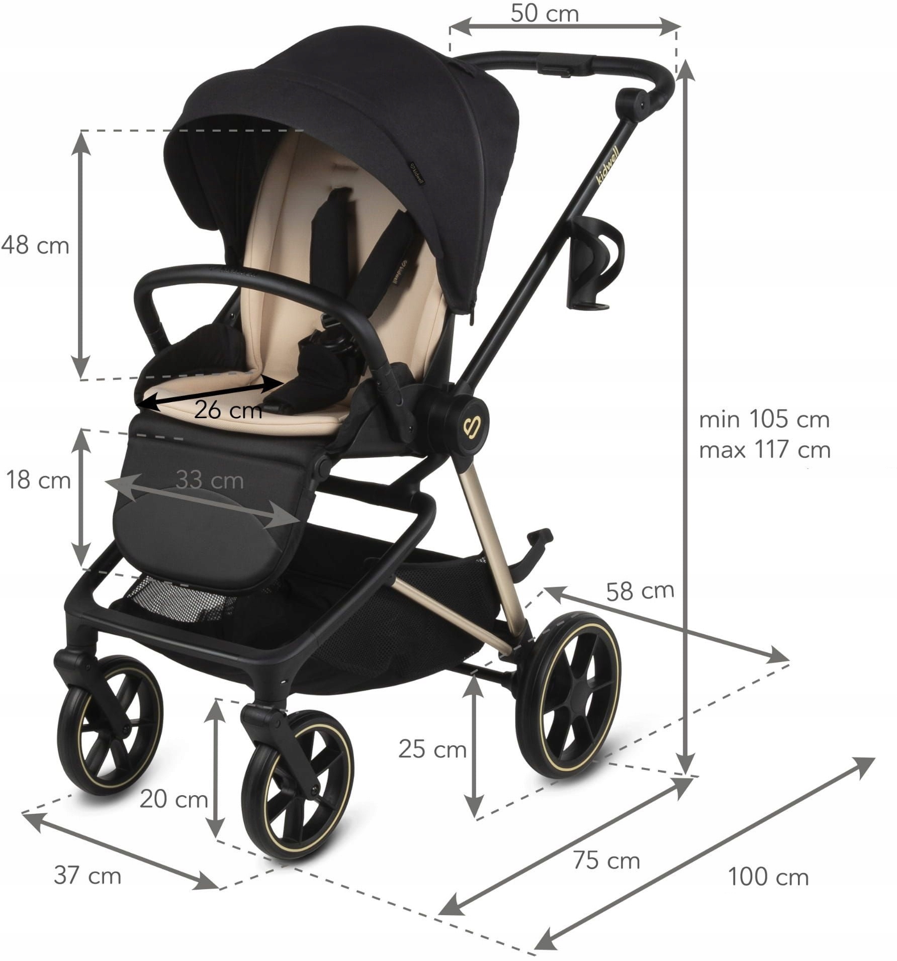 - Wymiary wózka spacerowego: 110x58x100 cm