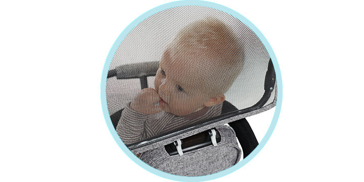 Za oparciem znajduje się siateczka, która zapewnia odpowiedni przepływ powietrza nawet w cieplejsze dni. Dodatkowo rodzic może mieć swoją pociechę zawsze na oku.
