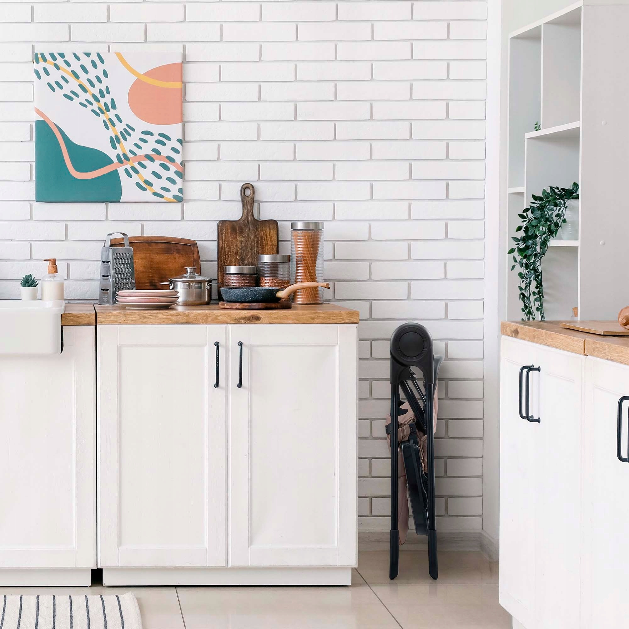 Po złożeniu krzesełko jest płaskie i zajmuje mało miejsca – zmieści się w szafie, wnęce, za drzwiami, a nawet w bagażniku. Świetne rozwiązanie do mniejszych mieszkań i dla rodzin, które lubią mobilność.