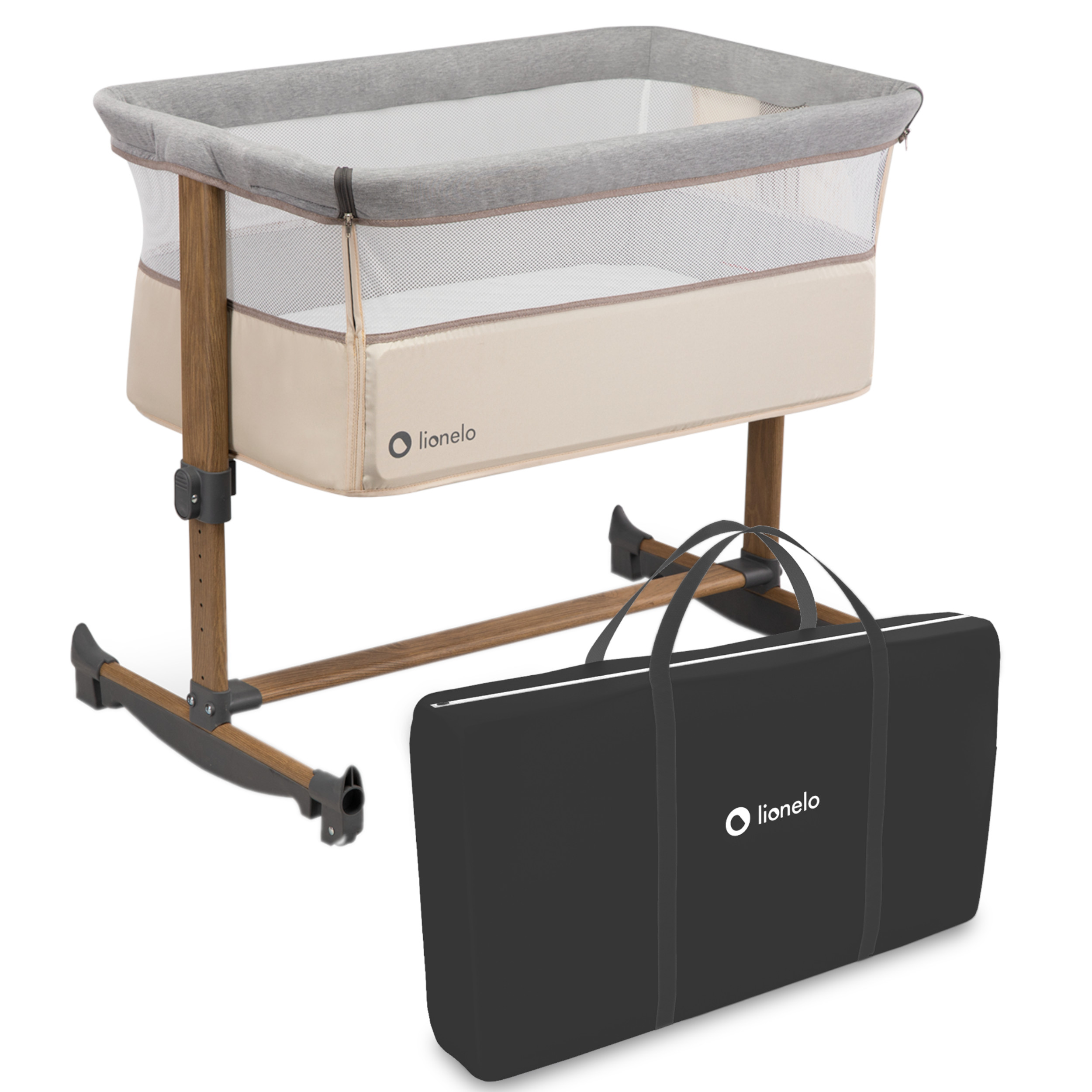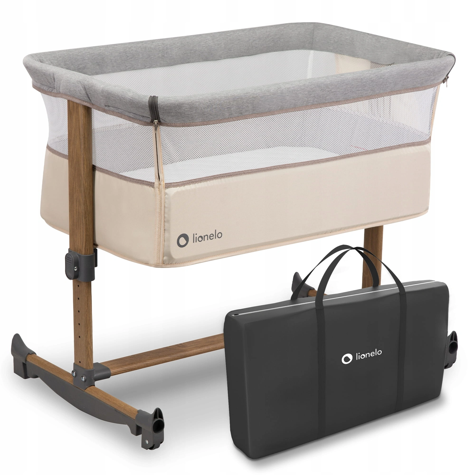 + ŁÓŻECZKO DOSTAWNE LIONELO LEONIE - FUNKCJA KOŁYSKI - TORBA TRANSPORTOWA (BEIGE SAND GREY)
