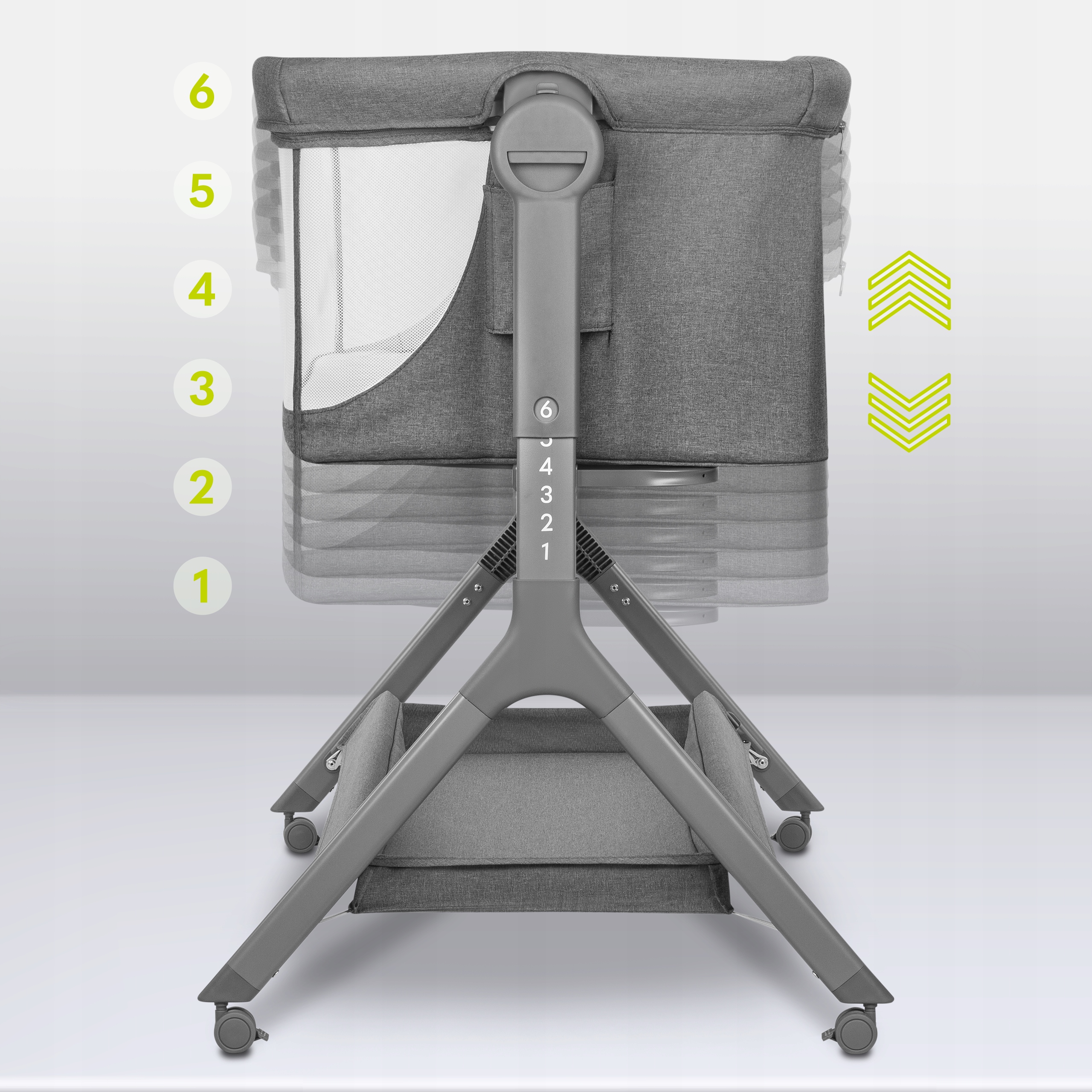 6-stopniowa, płynna regulacja pozwala na precyzyjne dopasowanie łóżeczka do każdego rodzaju i poziomu łóżka rodziców.