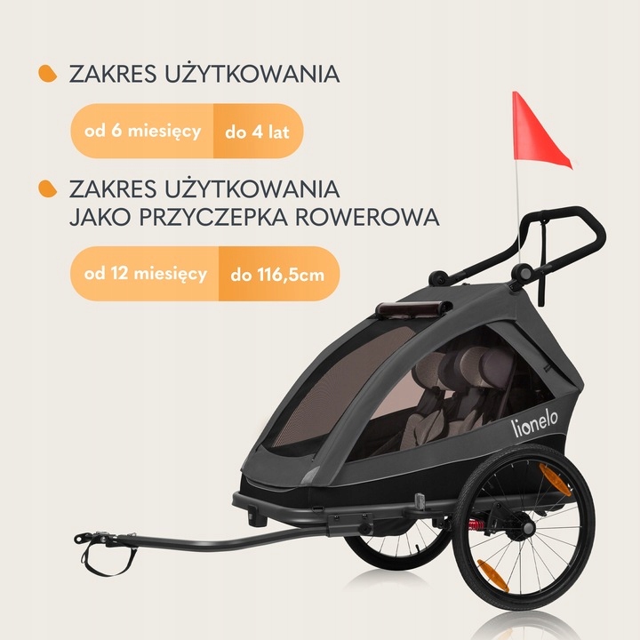 Zakres użytkowania dla funkcji przyczepki rowerowej: od 12miesięcy do 116,5 cm