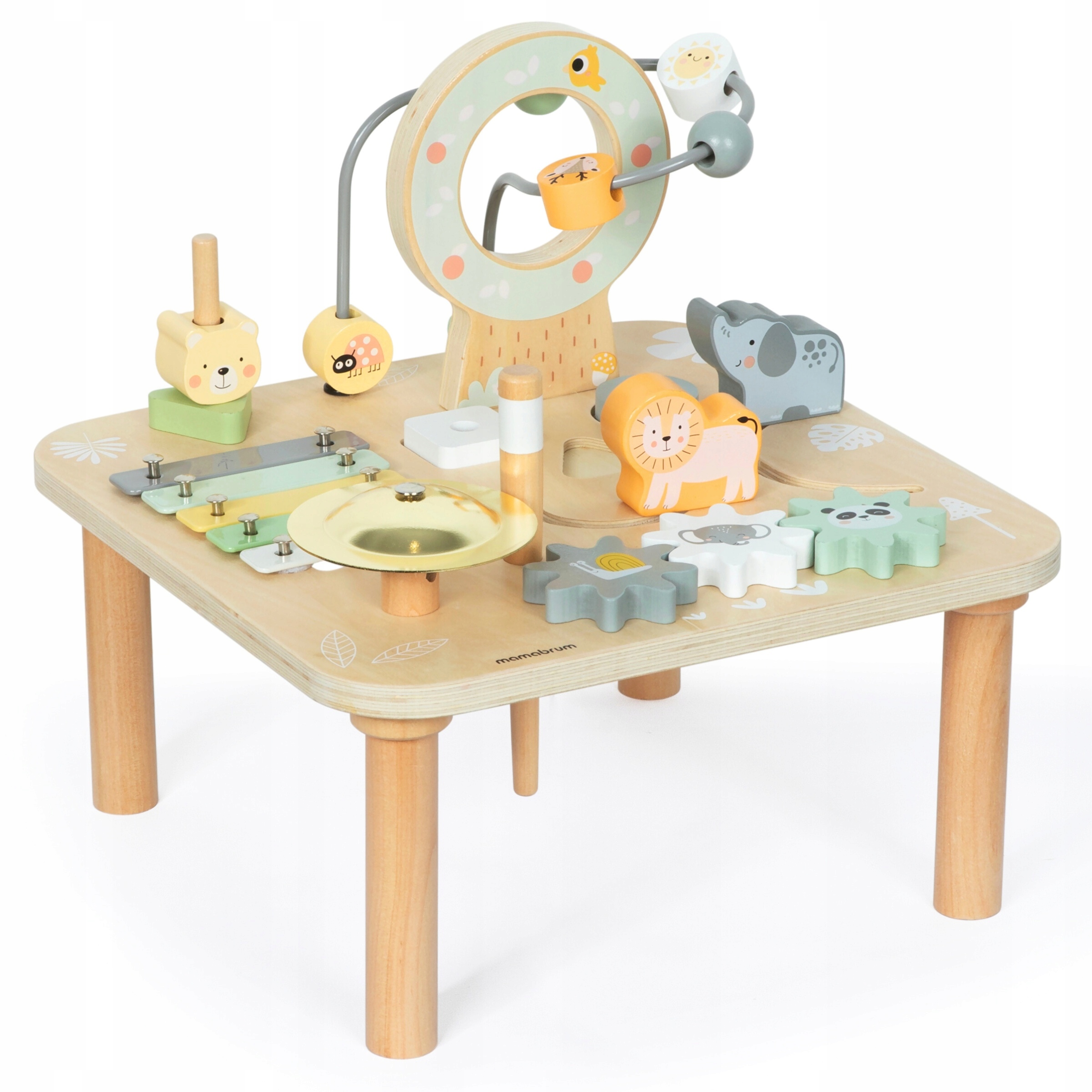 Drewniany stolik edukacyjny kwadratowy 7 w 1 z cymbałkami i gongiem - Dzika dżungla