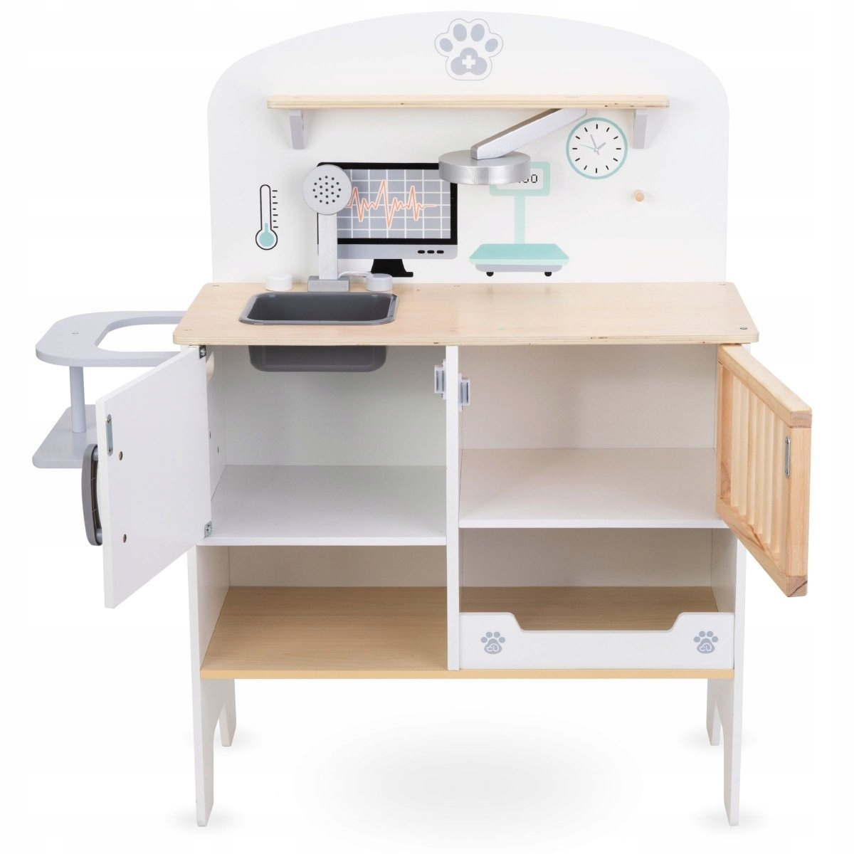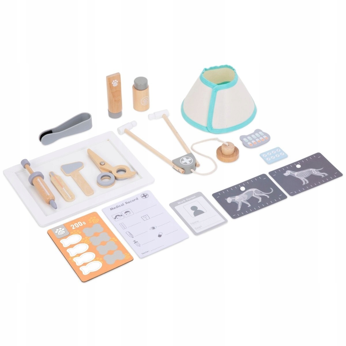 - 7 akcesoriów medycznych (termometr, młoteczek, ruchoma strzykawka, stetoskop, szczypce, nożyczki, taca)