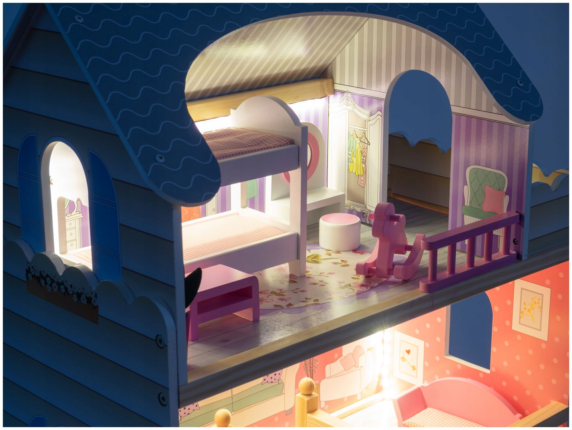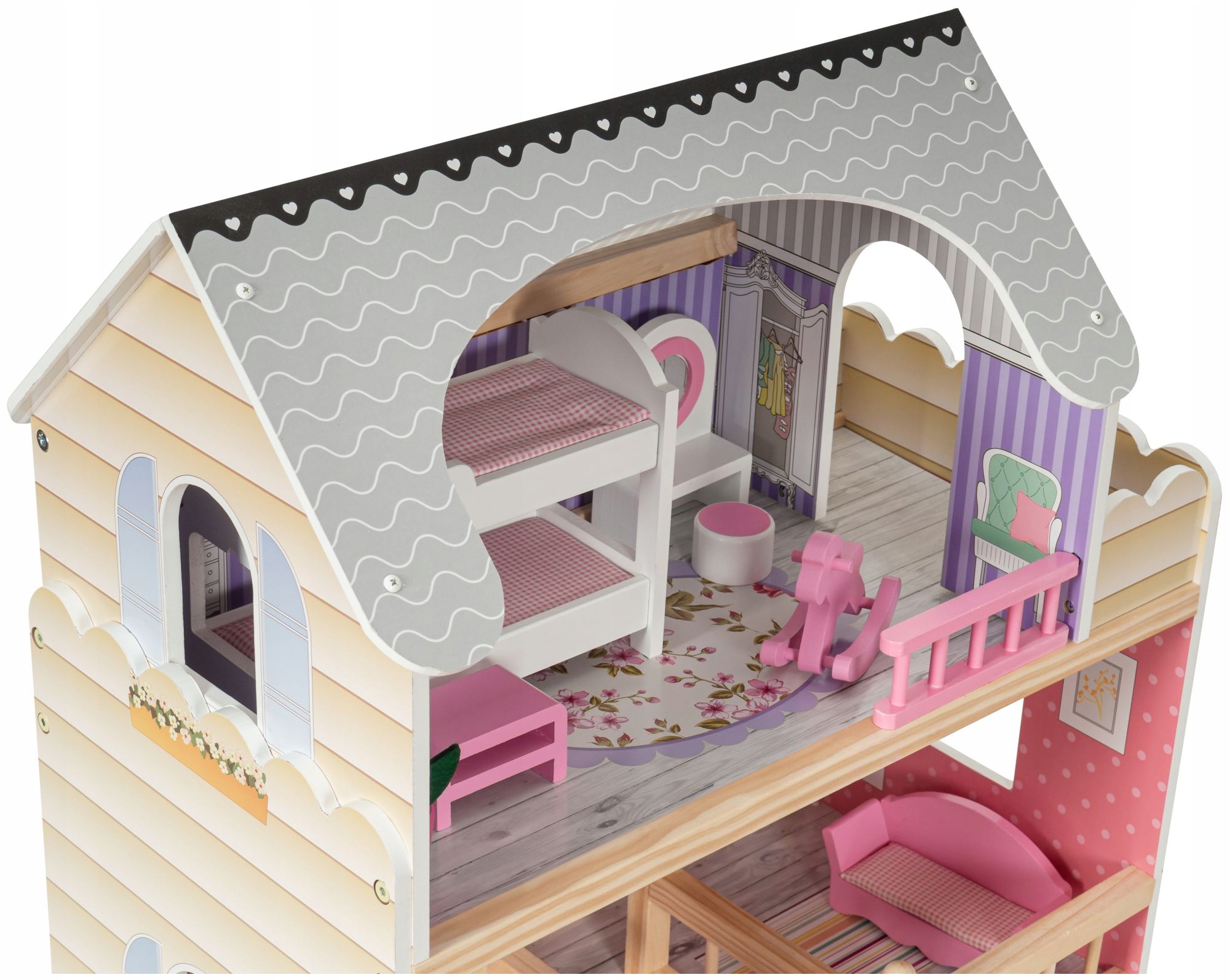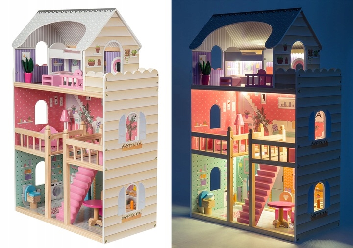 MamaBrum duży domek dla lalek drewniany LED Mebelki 3 Poziomy W06A405