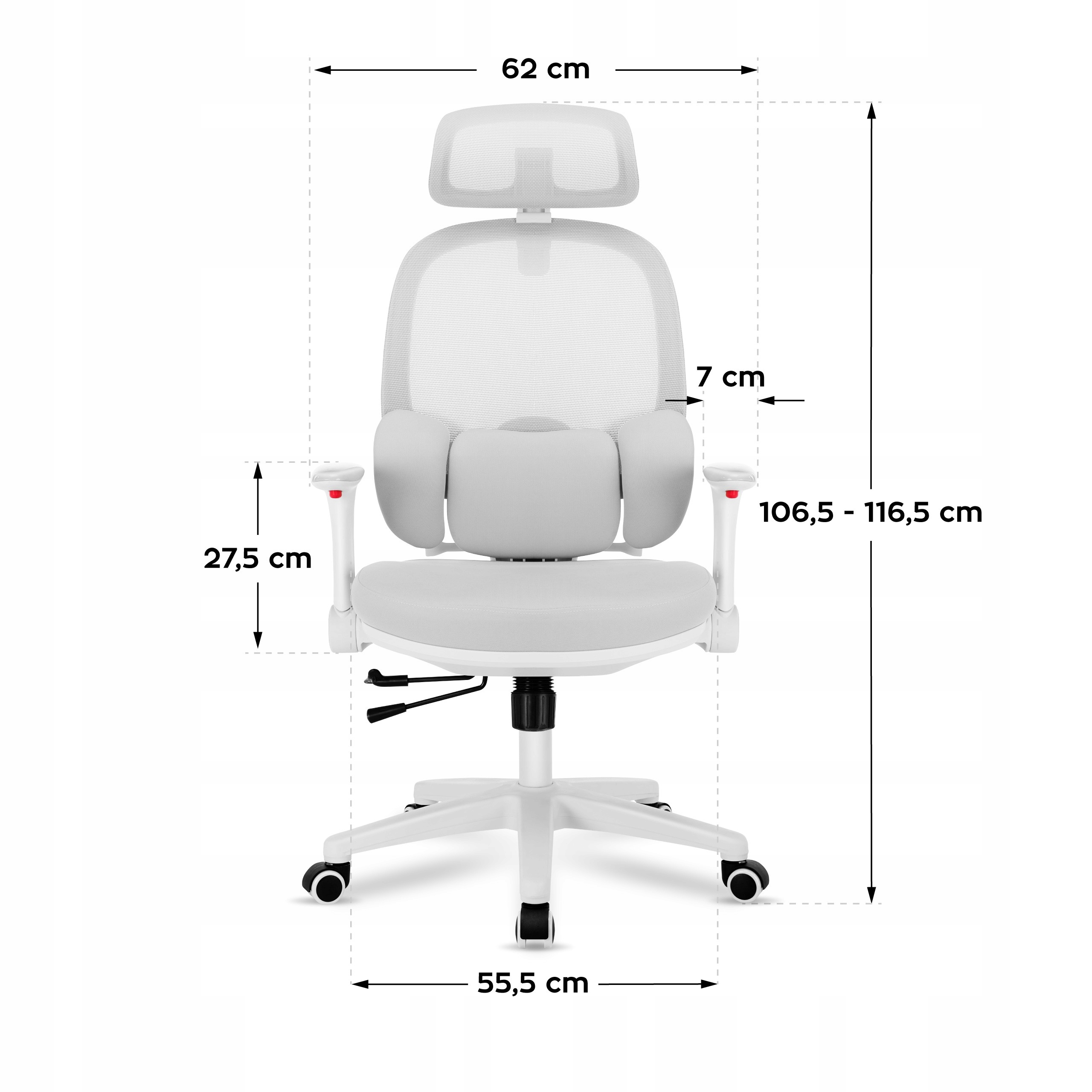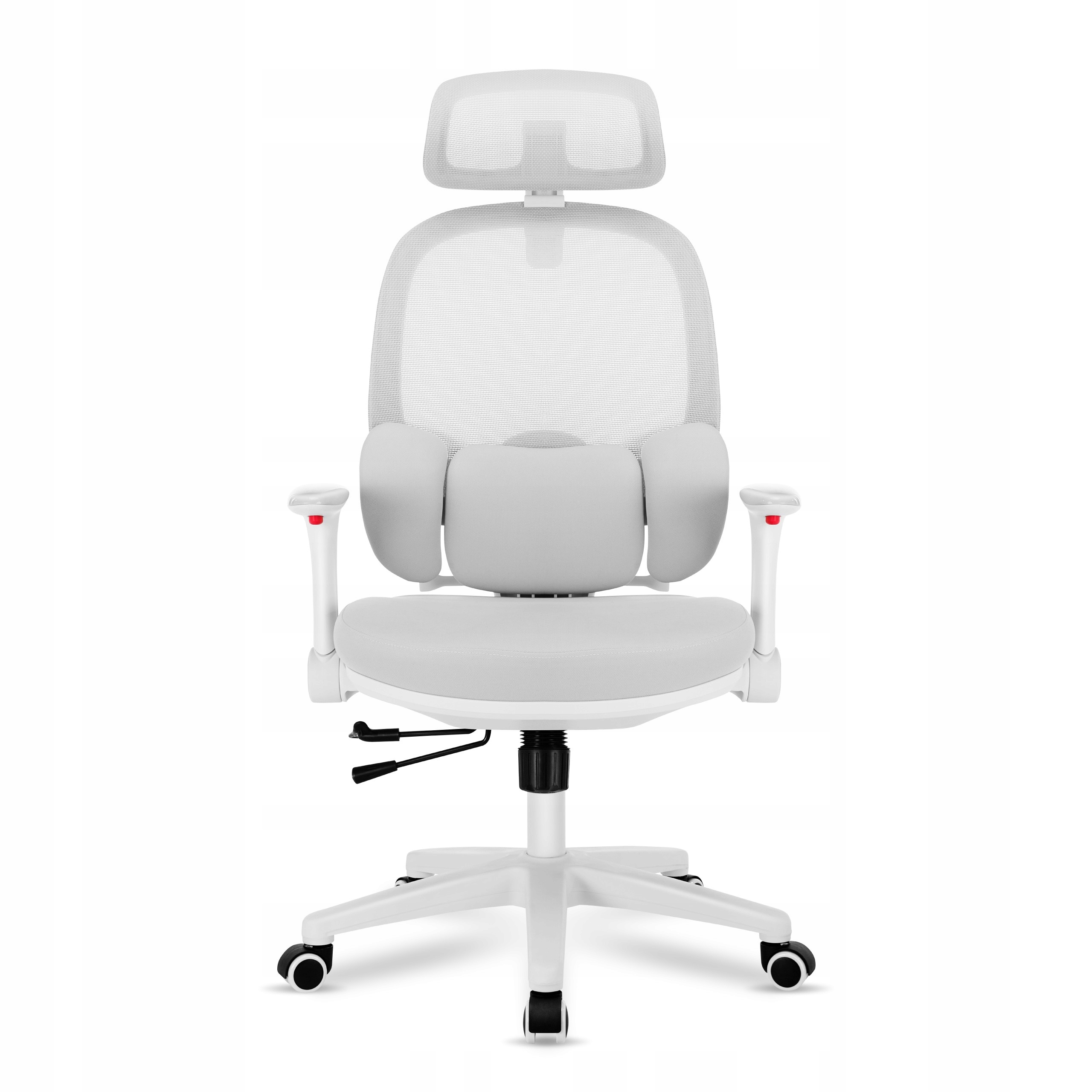 - Regulowany zagłówek 2D – umożliwia precyzyjne dopasowanie położenia podparcia dla szyi i głowy, zmniejszając napięcie karku podczas długiego siedzenia.