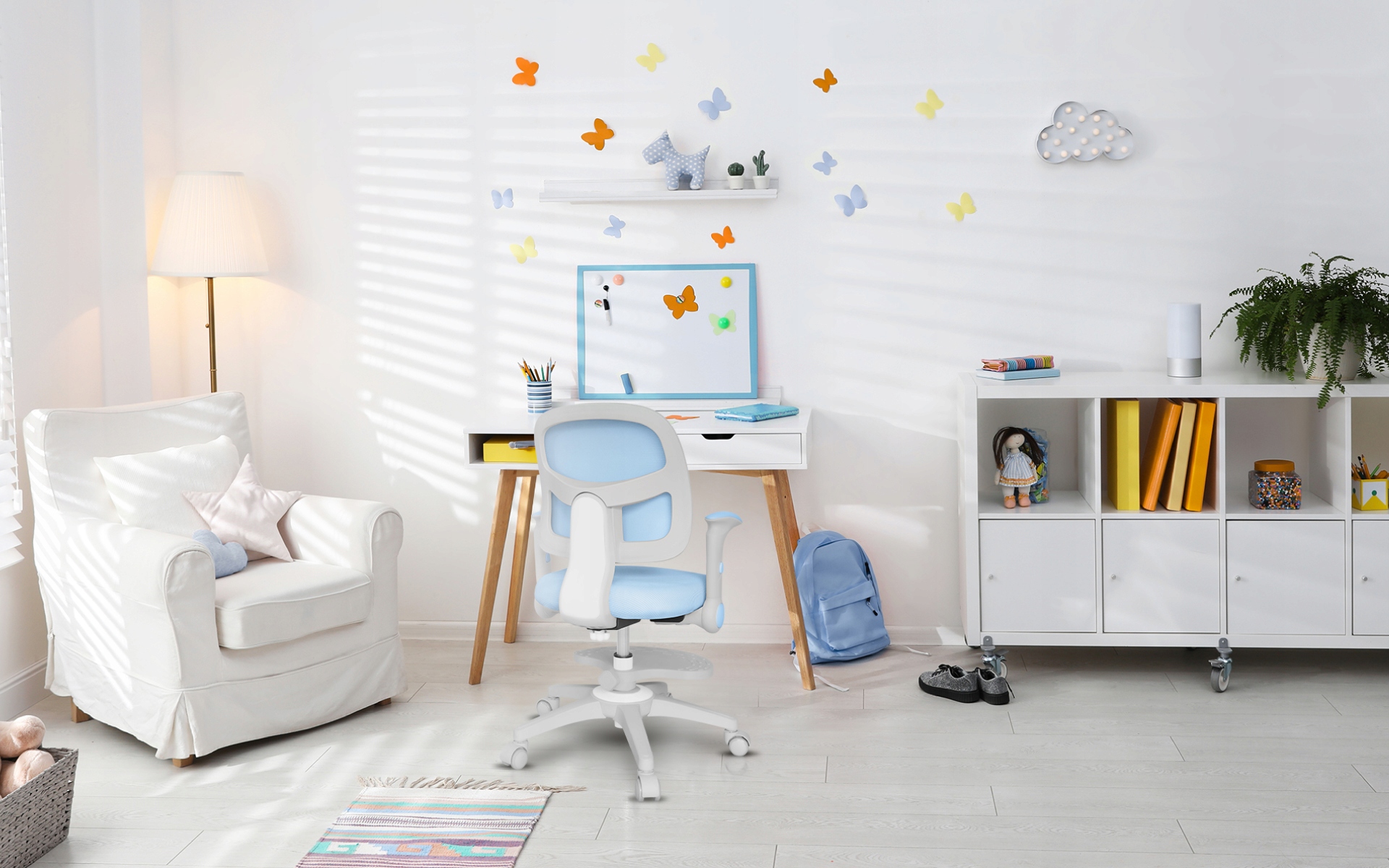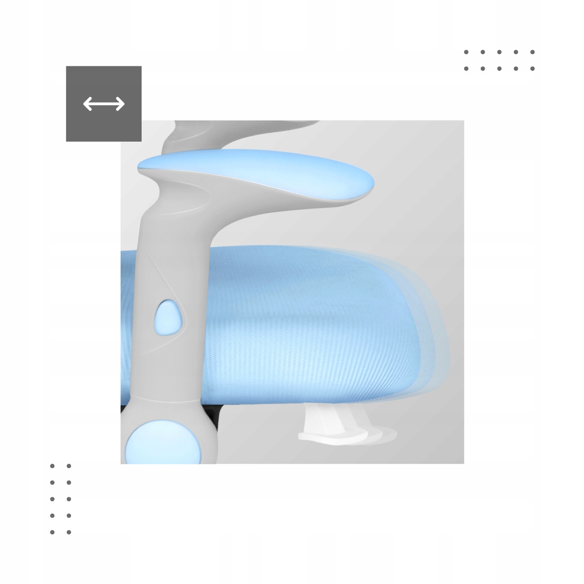 - Możliwość regulacji w zakresie góra – dół oraz poziomo pozwala na dopasowanie podłokietników do wzrostu dziecka, a także wsunięcie krzesła pod blat biurka.