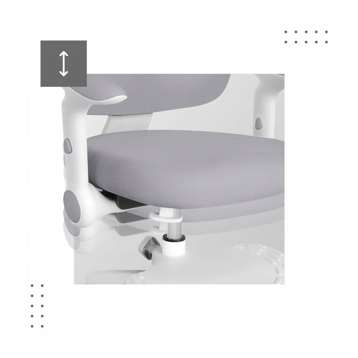 - Możliwość regulacji w zakresie góra – dół oraz poziomo pozwala na dopasowanie podłokietników do wzrostu dziecka, a także wsunięcie krzesła pod blat biurka.