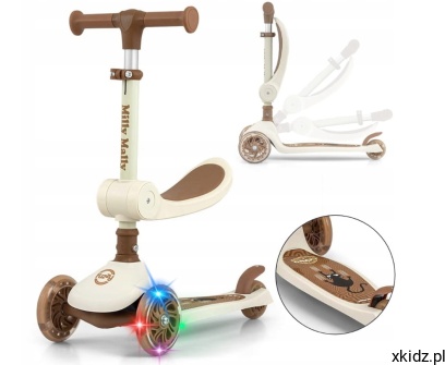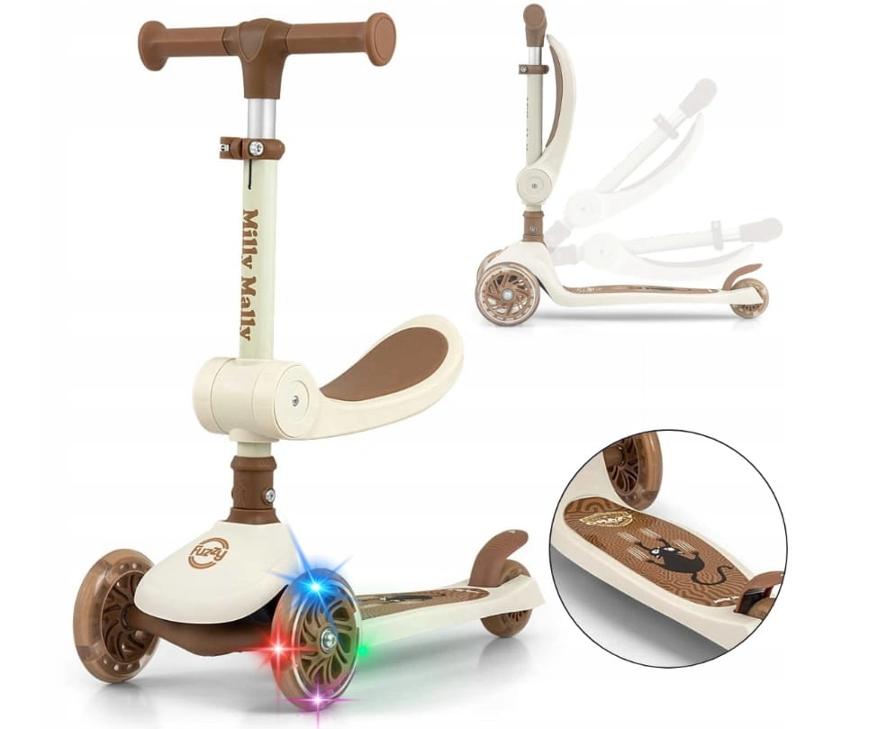 Hulajnoga Milly Mally Fuzzy 3w1 w kolorze beżowym to idealny pojazd dla maluchów od 18 miesiąca życia. Może pełnić funkcję jeździka, hulajnogi z siedziskiem oraz klasycznej hulajnogi. Świecące kółka LED, regulowana kierownica i antypoślizgowy podest zapewniają bezpieczeństwo i frajdę z jazdy. Lekka i funkcjonalna – idealna na spacer i do nauki równowagi!
