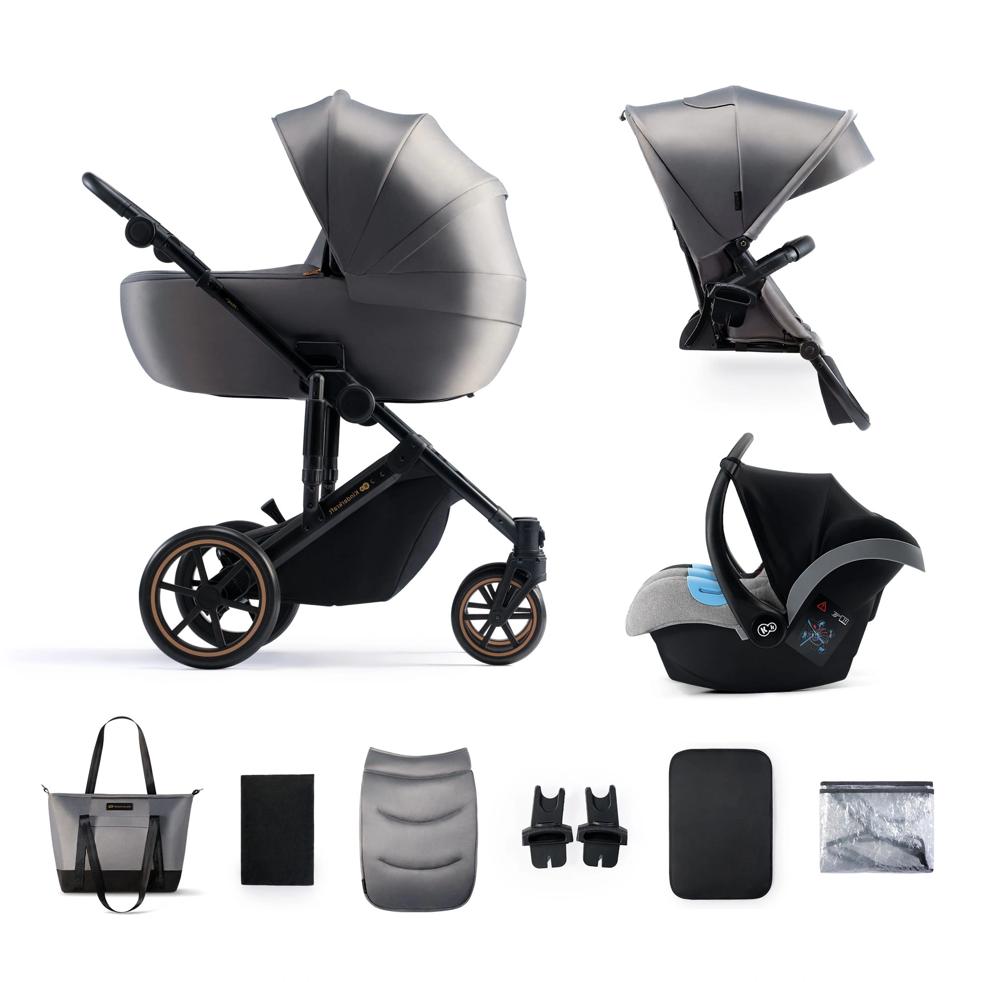 - W ZESTAWIE Z gondolą, siedziskiem spacerowym, stelażem, fotelikiem samochodowym Kinderkraft 0-13 kg, adapterami do fotelika, torbą, przewijakiem, osłoną na nóżki, folią przeciwdeszczową, moskitierą, materacykiem do gondoli.