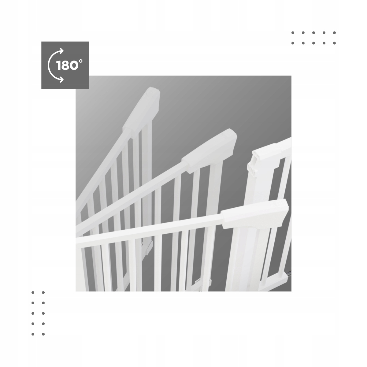 Barierka otwiera się w obie strony osiągając aż 180° stopni ruchu. Jest to bardzo wygodne rozwiązanie, gdyż niezależnie od której strony podchodzisz, zawsze możesz wygodnie ją otworzyć — ruchem do siebie lub od siebie.