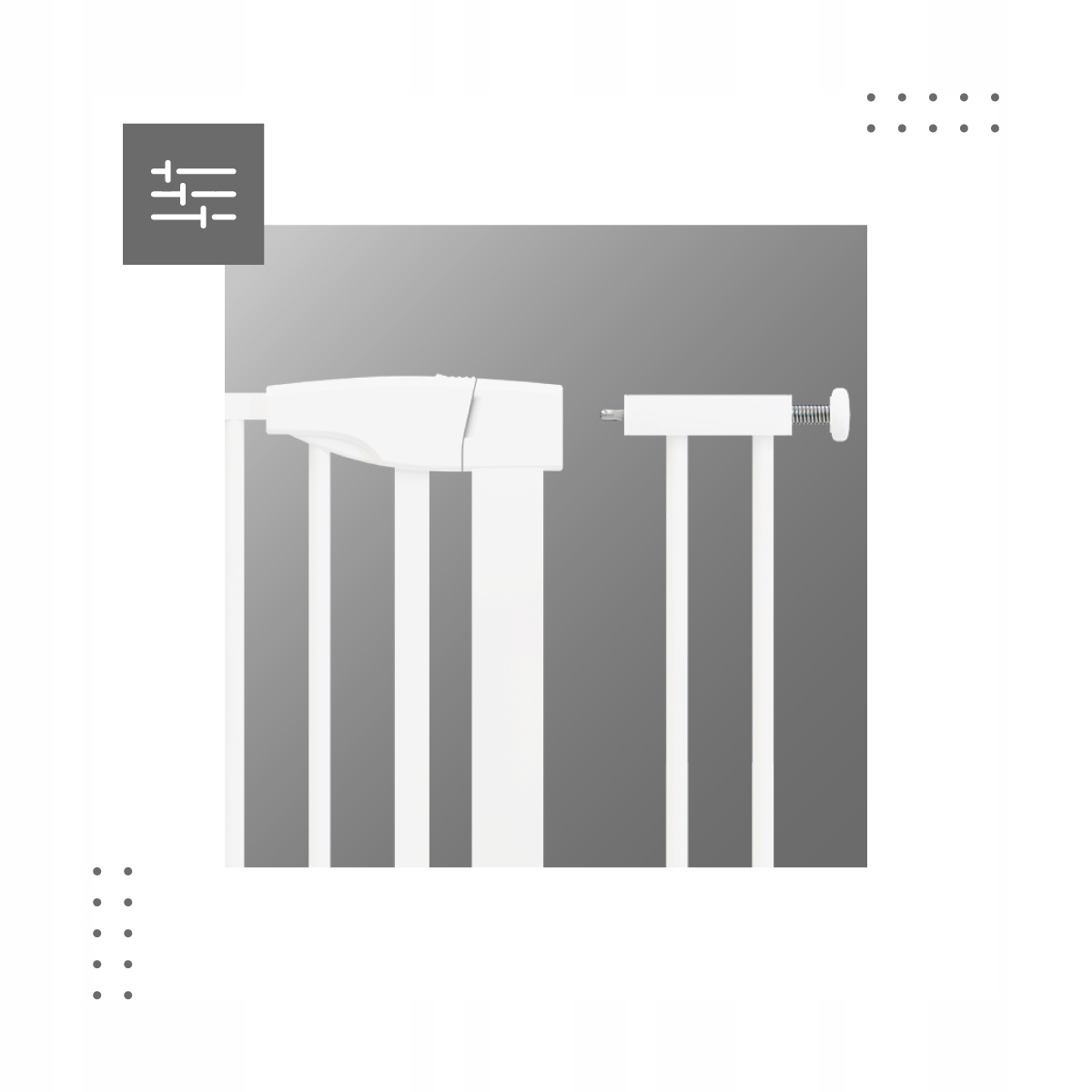 Guardian to uniwersalna bramka, którą można bez obaw zamontować nie tylko do ściany czy barierki schodów, ale także do futryny (ościeżnicy) drzwi. Bramka nie zostawia śladów na ościeżnicy, jest bezpieczna dla drzwi i łatwo ją zarówno zamontować, jak i zdemontować.