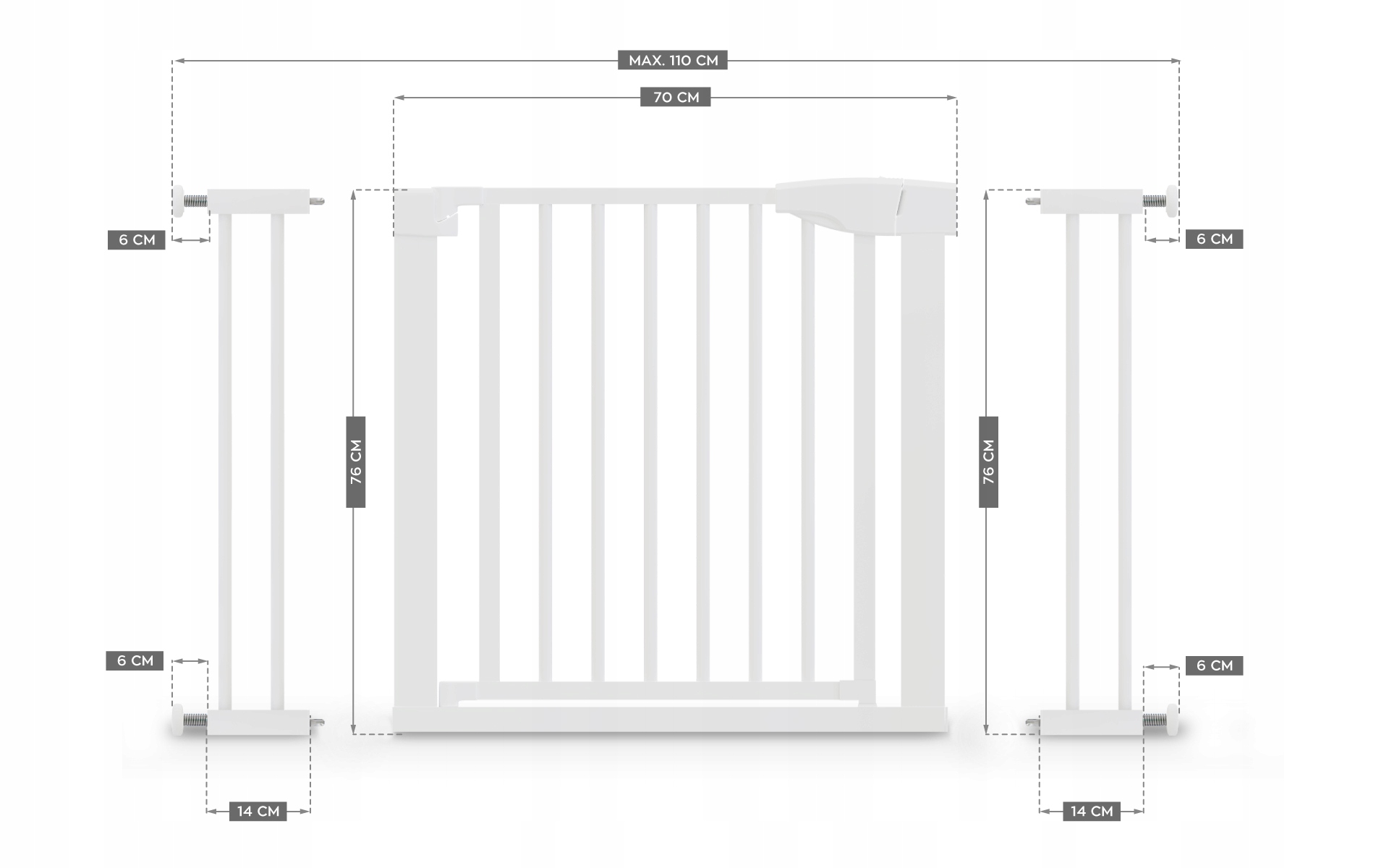 Barierka montowana jest rozporowo, a więc bez potrzeby wiercenia otworów w ścianie. Montaż jest niezwykle prosty i zajmuje dosłownie chwilę. Barierka dzięki systemowi przedłużek może być stosowana w otworach o szerokości od 75 do aż 110 cm.