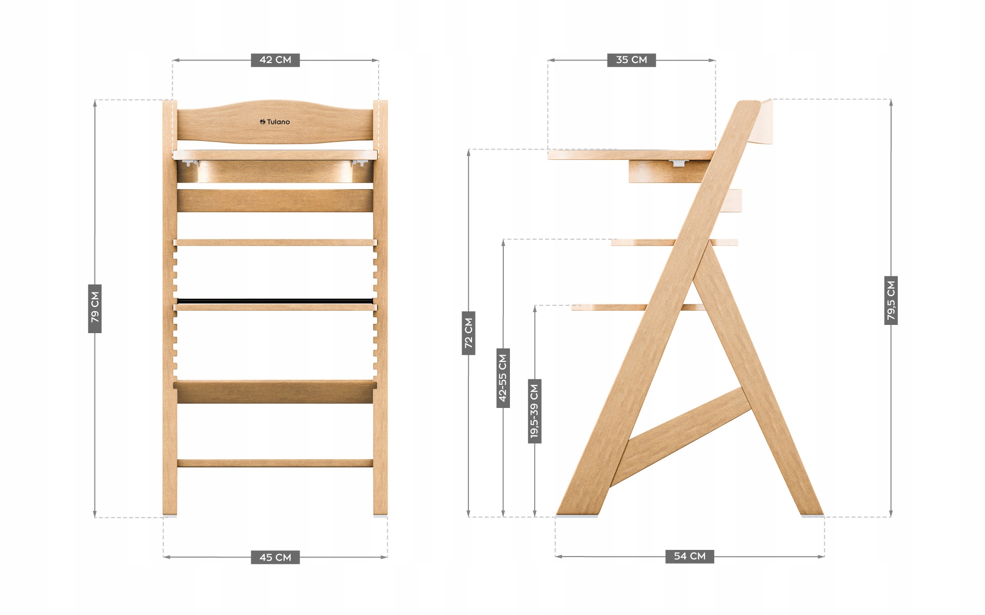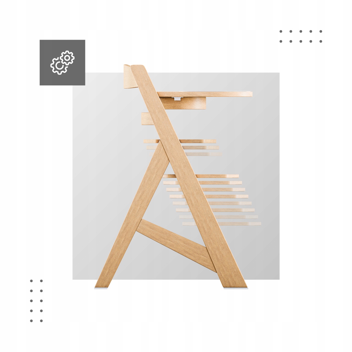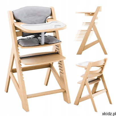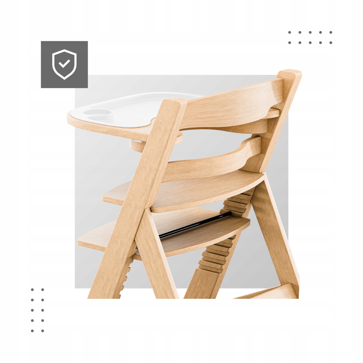- Funkcjonalność krzesełka do karmienia zwiększa zdejmowana taca z nakładką z tworzywa sztucznego. Takie rozwiązanie jest higieniczne i zapobiega odbarwieniom, które mogą pojawić się na drewnianych tacach.