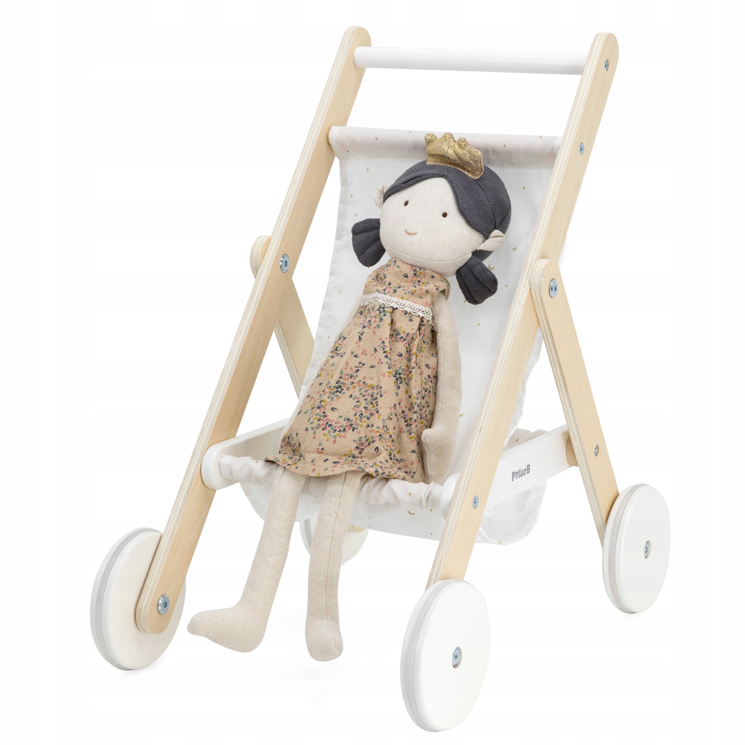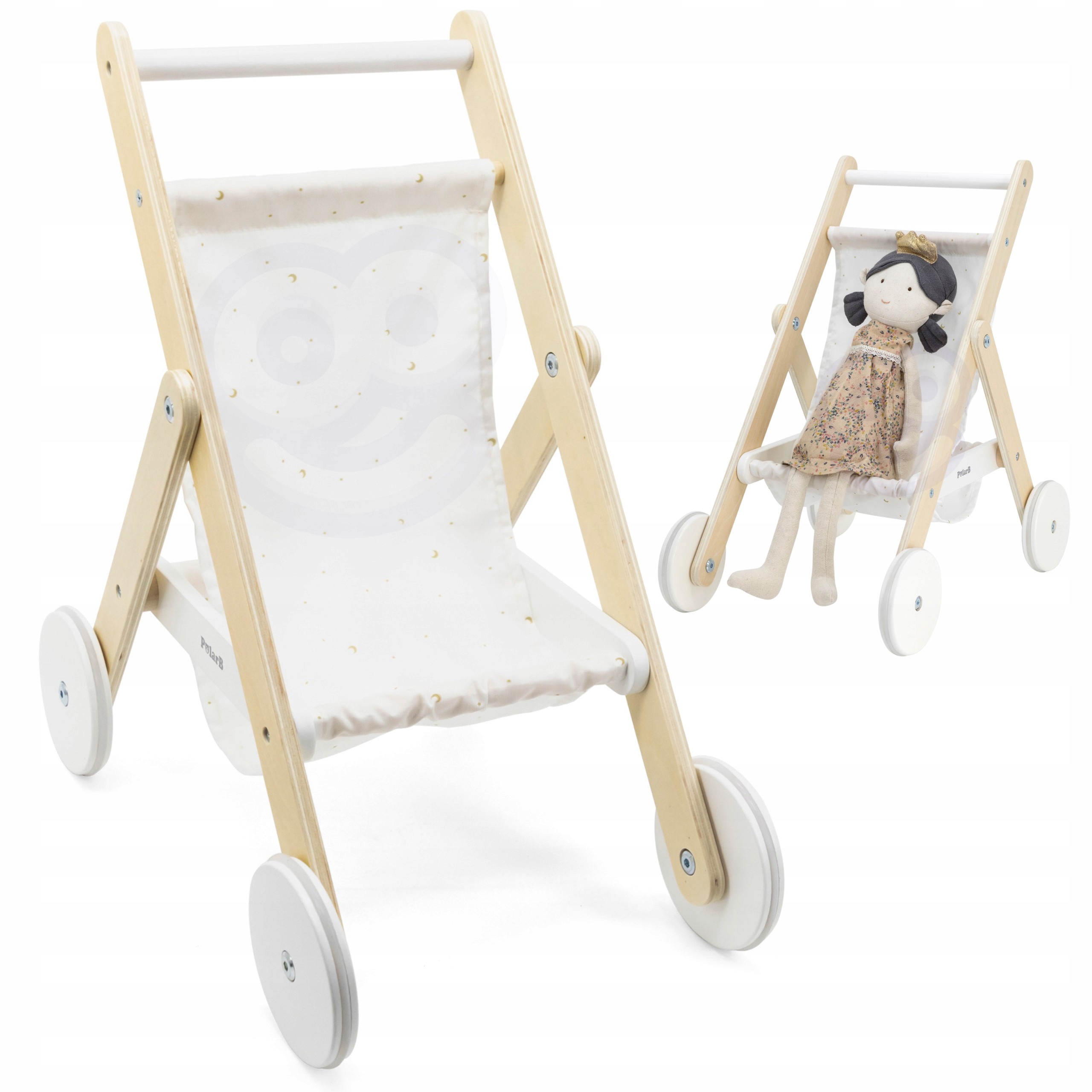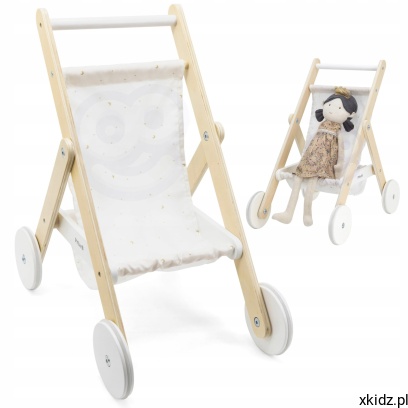Zabierz swoją ulubioną lalkę lub misia na spacer w drewnianym wózku z serii PolarB od marki VIGA. Wózek posiada solidną drewnianą ramę, materiał ozdobiony jest nadrukiem gwiazd i księżyca, pod spodem poręczny kosz do przechowywania akcesoriów. Guma na kołach została dodana dla dodatkowej ochrony i redukcji hałasu a także dla najmłodszych aby mogli chodzić stabilnie i pewnie. Pasuje do lalek o wysokości do 38 cm